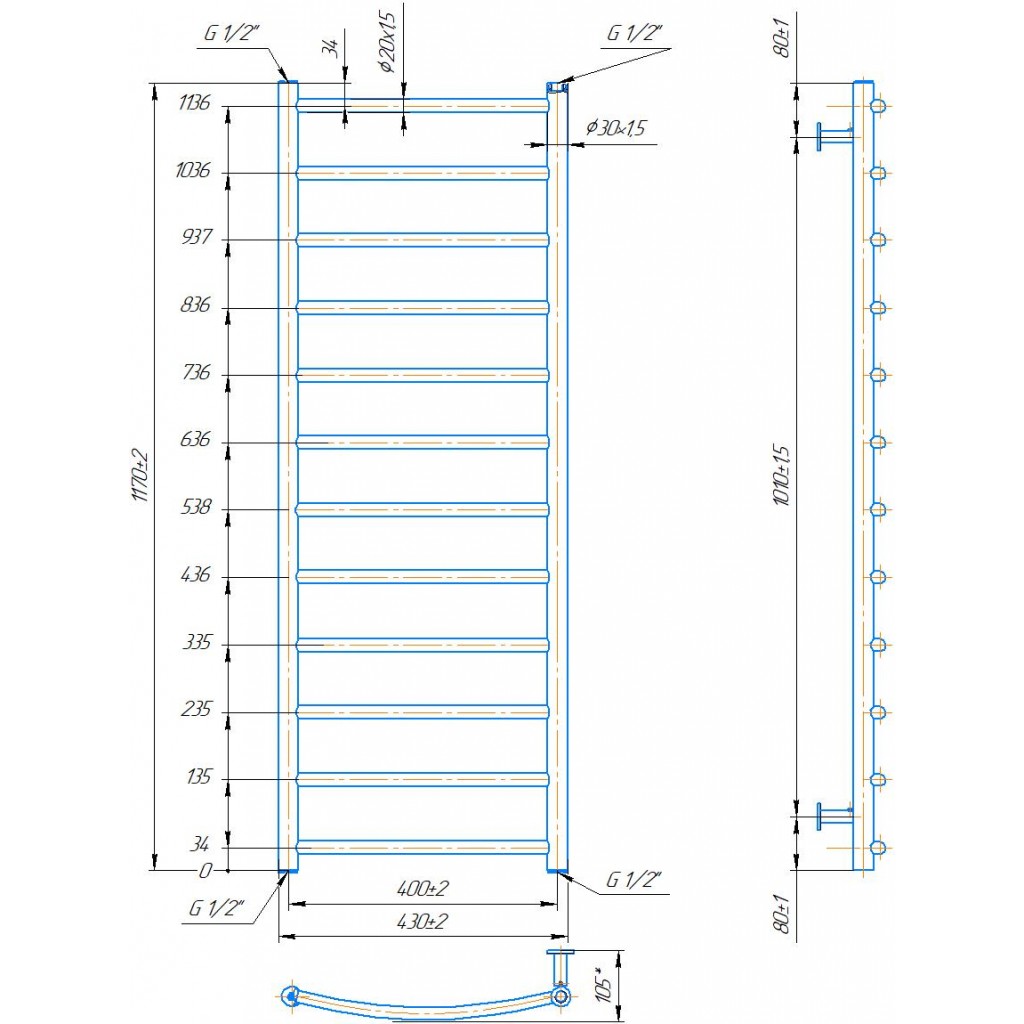 Рушникосушарка INOX Класік 1170х430/400. Розміри: висота - 1 170 мм, ширина - 430 мм, глибина 90 мм, міжцентрова відстань для підключення - 400 мм, діаметр підключення G1/2''. Варіанти підключення: нижнє, діагональне та бічне. Кількість ребер - 12. Виготовлена з полірованої нержавіючої сталі без хромування. Для всесезонної роботи водяну модель можна переобладнати на комбіновану, встановивши ТЕН, рекомендована потужність 300 Вт. Сумісні аксесуари: поворотні полиці та навісні гачки для збільшення функціональності. Рекомендовано підключати рушникосушарку за допомогою кранів Маріо. Гарантія - 50 років в закритій системі опалення, 5 років у централізованій.