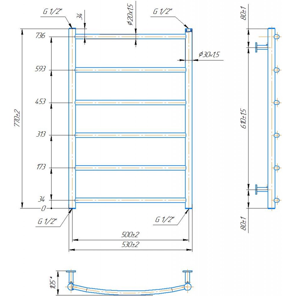 Рушникосушарка INOX Класік HP 770х530/500. Розміри: висота - 770 мм, ширина - 530 мм, глибина 85 мм, міжцентрова відстань для підключення - 500 мм, діаметр підключення G1/2''. Варіанти підключення: нижнє, діагональне та бічне. Кількість ребер - 6. Виготовлена з полірованої нержавіючої сталі без хромування. Для всесезонної роботи водяну модель можна переобладнати на комбіновану, встановивши ТЕН, рекомендована потужність 200 Вт. Сумісні аксесуари: поворотні полиці та навісні гачки для збільшення функціональності. Рекомендовано підключати рушникосушарку за допомогою кранів Маріо. Гарантія - 50 років в закритій системі опалення, 5 років у централізованій.