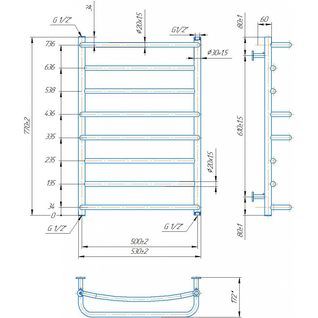 Рушникосушарка INOX Люкс 770х530/500. Розміри: висота - 770 мм, ширина - 530 мм, глибина 160 мм, міжцентрова відстань для підключення - 500 мм, діаметр підключення G1/2''. Варіанти підключення: нижнє, діагональне та бічне. Кількість ребер - 8. Виготовлена з полірованої нержавіючої сталі без хромування. Для всесезонної роботи водяну модель можна переобладнати на комбіновану, встановивши ТЕН, рекомендована потужність 200 Вт. Сумісні аксесуари: поворотні полиці та навісні гачки для збільшення функціональності. Рекомендовано підключати рушникосушарку за допомогою кранів Маріо. Гарантія - 50 років в закритій системі опалення, 5 років у централізованій.
