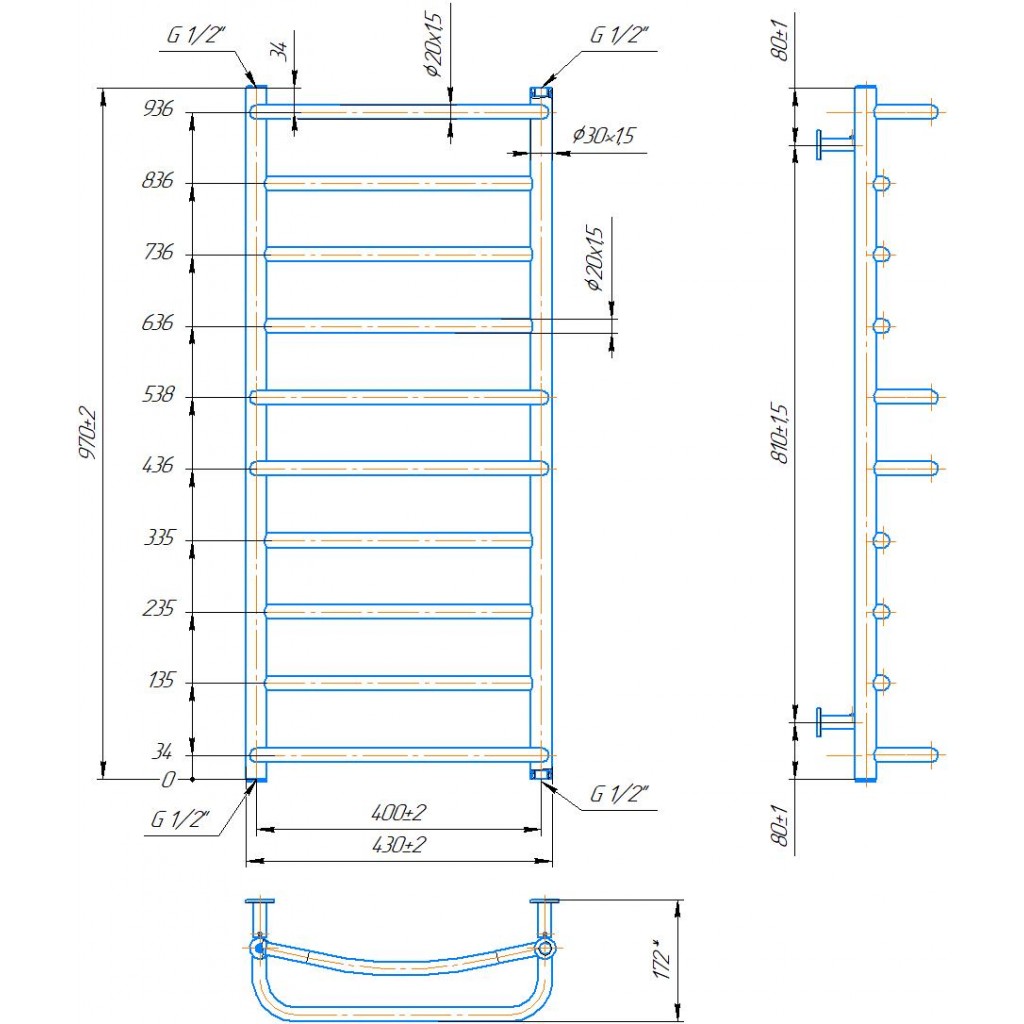 Рушникосушарка INOX Люкс 970х430/400. Розміри: висота - 970 мм, ширина - 430 мм, глибина 160 мм, міжцентрова відстань для підключення - 400 мм, діаметр підключення G1/2''. Варіанти підключення: нижнє, діагональне та бічне. Кількість ребер - 10. Виготовлена з полірованої нержавіючої сталі без хромування. Для всесезонної роботи водяну модель можна переобладнати на комбіновану, встановивши ТЕН, рекомендована потужність 200 Вт. Сумісні аксесуари: поворотні полиці та навісні гачки для збільшення функціональності. Рекомендовано підключати рушникосушарку за допомогою кранів Маріо. Гарантія - 50 років в закритій системі опалення, 5 років у централізованій.