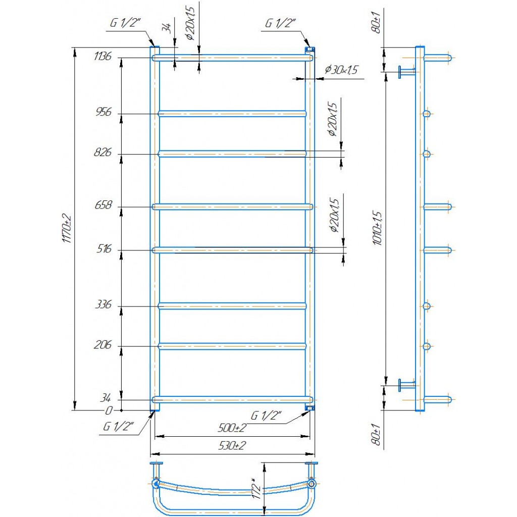 рушникосушка - 1шт. комплект кріплень - 1шт. кран Маєвського - 1 шт. заглушка - 1шт. паспорт - 1шт. коробка - 1шт.Розміри | 1170x530 |