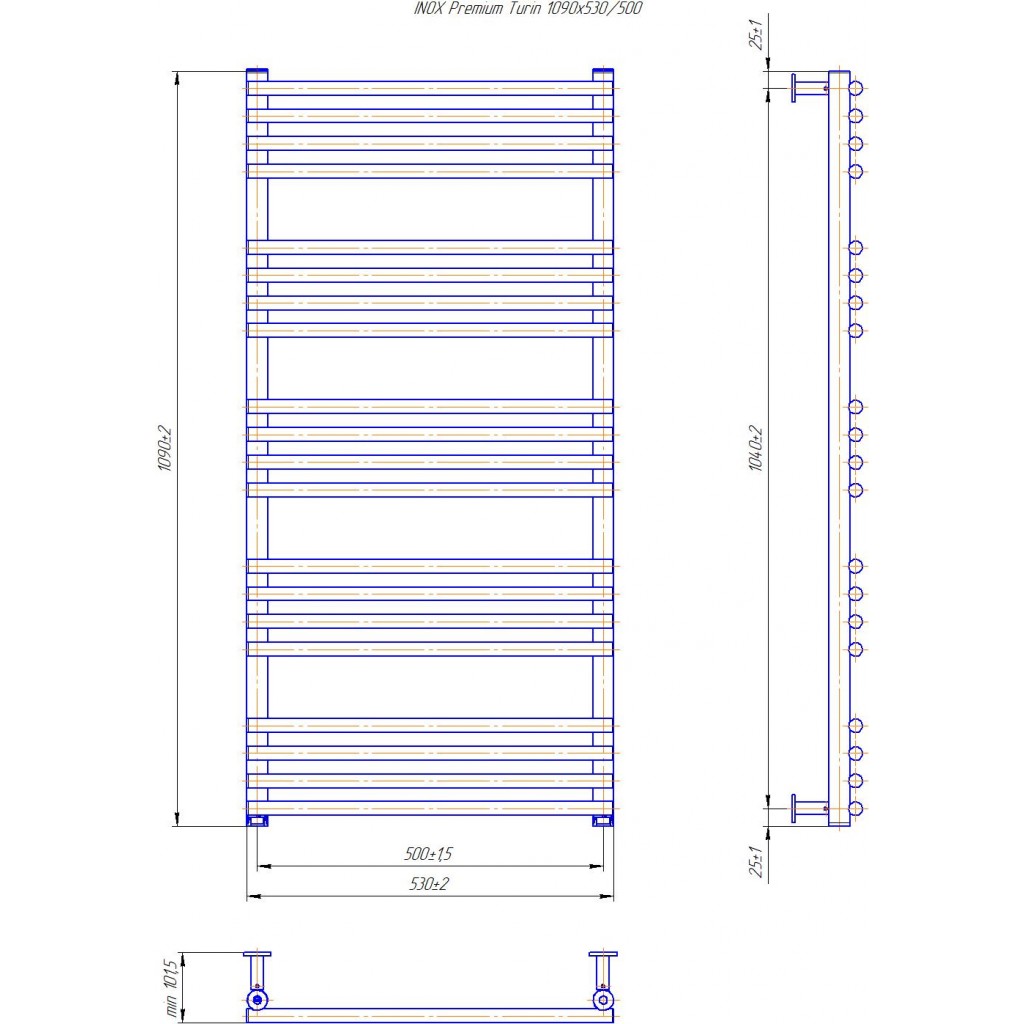 Рушникосушарка INOX Преміум Турин 1090х530/500. Розміри: висота - 1 090 мм, ширина - 530 мм, глибина 80 мм, міжцентрова відстань для підключення - 500 мм, діаметр підключення G1/2''. Варіанти підключення: нижнє, діагональне та бічне. Кількість ребер - 20. Виготовлена з полірованої нержавіючої сталі без хромування. Для всесезонної роботи водяну модель можна переобладнати на комбіновану, встановивши ТЕН, рекомендована потужність 600 Вт. Сумісні аксесуари: поворотні полиці та навісні гачки для збільшення функціональності. Рекомендовано підключати рушникосушарку за допомогою кранів Маріо. Гарантія - 50 років в закритій системі опалення, 5 років у централізованій.