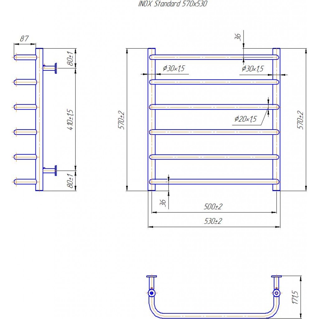 Водяна рушникосушарка INOX Стандарт 570х530/500. Розміри: висота - 570 мм, ширина - 530 мм, глибина 170 мм, міжцентрова відстань для підключення - 500 мм, діаметр підключення G1/2''. Варіанти підключення: нижнє, діагональне та бічне. Кількість ребер - 6. Виготовлена з полірованої нержавіючої сталі без хромування. Для всесезонної роботи водяну модель можна переобладнати на комбіновану, встановивши ТЕН, рекомендована потужність 200 Вт. Сумісні аксесуари: поворотні полиці та навісні гачки для збільшення функціональності. Рекомендовано підключати рушникосушарку за допомогою кранів Маріо. Гарантія - 50 років в закритій системі опалення, 5 років у централізованій.