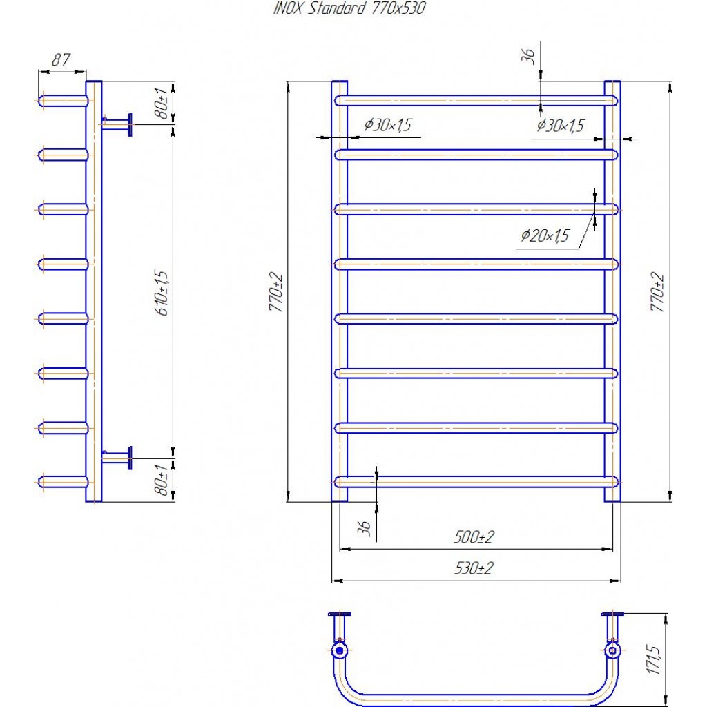 Водяна рушникосушарка INOX Стандарт 770х530/500. Розміри: висота - 770 мм, ширина - 530 мм, глибина 170 мм, міжцентрова відстань для підключення - 500 мм, діаметр підключення G1/2''. Варіанти підключення: нижнє, діагональне та бічне. Кількість ребер - 8. Виготовлена з полірованої нержавіючої сталі без хромування. Для всесезонної роботи водяну модель можна переобладнати на комбіновану, встановивши ТЕН, рекомендована потужність 300 Вт. Сумісні аксесуари: поворотні полиці та навісні гачки для збільшення функціональності. Рекомендовано підключати рушникосушарку за допомогою кранів Маріо. Гарантія - 50 років в закритій системі опалення, 5 років у централізованій.