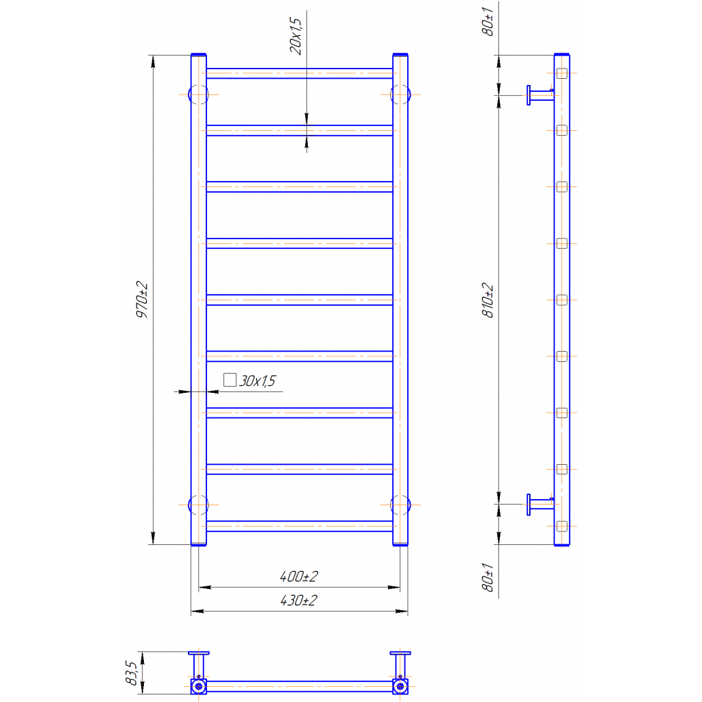 Рушникосушарка INOX Токіо 970х430/400. Розміри: висота - 970 мм, ширина - 430 мм, глибина 80 мм, міжцентрова відстань для підключення - 0 мм, діаметр підключення G1/2''. Варіанти підключення: нижнє, діагональне та бічне. Кількість ребер - 0. Виготовлена з полірованої нержавіючої сталі без хромування. Для всесезонної роботи водяну модель можна переобладнати на комбіновану, встановивши ТЕН, рекомендована потужність . Сумісні аксесуари: поворотні полиці та навісні гачки для збільшення функціональності. Рекомендовано підключати рушникосушарку за допомогою кранів Маріо. Гарантія - 50 років в закритій системі опалення, 5 років у централізованій.