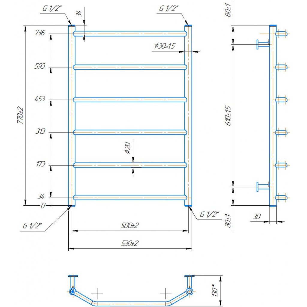 Рушникосушарка INOX Трапеція 770х530/500. Розміри: висота - 770 мм, ширина - 530 мм, глибина 130 мм, міжцентрова відстань для підключення - 500 мм, діаметр підключення G1/2''. Варіанти підключення: нижнє, діагональне та бічне. Кількість ребер - 6. Виготовлена з полірованої нержавіючої сталі без хромування. Для всесезонної роботи водяну модель можна переобладнати на комбіновану, встановивши ТЕН, рекомендована потужність 300 Вт. Сумісні аксесуари: поворотні полиці та навісні гачки для збільшення функціональності. Рекомендовано підключати рушникосушарку за допомогою кранів Маріо. Гарантія - 50 років в закритій системі опалення, 5 років у централізованій.