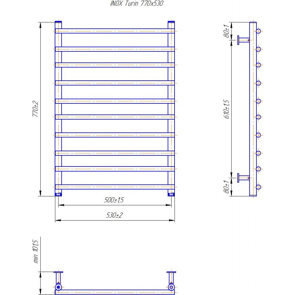 Рушникосушарка INOX Турин 770х530/500. Розміри: висота - 770 мм, ширина - 530 мм, глибина 80 мм, міжцентрова відстань для підключення - 500 мм, діаметр підключення G1/2''. Варіанти підключення: нижнє, діагональне та бічне. Кількість ребер - 10. Виготовлена з полірованої нержавіючої сталі без хромування. Для всесезонної роботи водяну модель можна переобладнати на комбіновану, встановивши ТЕН, рекомендована потужність 200 Вт. Сумісні аксесуари: поворотні полиці та навісні гачки для збільшення функціональності. Рекомендовано підключати рушникосушарку за допомогою кранів Маріо. Гарантія - 50 років в закритій системі опалення, 5 років у централізованій.