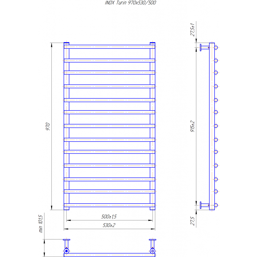 Рушникосушарка INOX Турин 970х530/500. Розміри: висота - 970 мм, ширина - 530 мм, глибина 80 мм, міжцентрова відстань для підключення - 500 мм, діаметр підключення G1/2''. Варіанти підключення: нижнє, діагональне та бічне. Кількість ребер - 13. Виготовлена з полірованої нержавіючої сталі без хромування. Для всесезонної роботи водяну модель можна переобладнати на комбіновану, встановивши ТЕН, рекомендована потужність 300 Вт. Сумісні аксесуари: поворотні полиці та навісні гачки для збільшення функціональності. Рекомендовано підключати рушникосушарку за допомогою кранів Маріо. Гарантія - 50 років в закритій системі опалення, 5 років у централізованій.