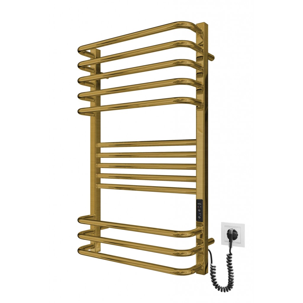 Бытовая электрическая полотенцесушилка Рушникосушка Гера-Люкс-I 800х500/170 електр. TR К золото сатин. Оснащена таймер-регулятором и коннектором для подключения к розетке с любой стороны. Совместима с комплектом скрытого подключения. Имеет 13 перекладин и стойки. Изготовлена из полированной нержавеющей стали без хромирования. Температурные режимы таймер-регулятора: 40°С, 45°С, 50°С. Варианты времени работы: 3, 6 часов и постоянный нагрев. Мощность [3 Вт]. Для удобства использования можно дополнительно оснастить навесными крючками. Гарантия — .
