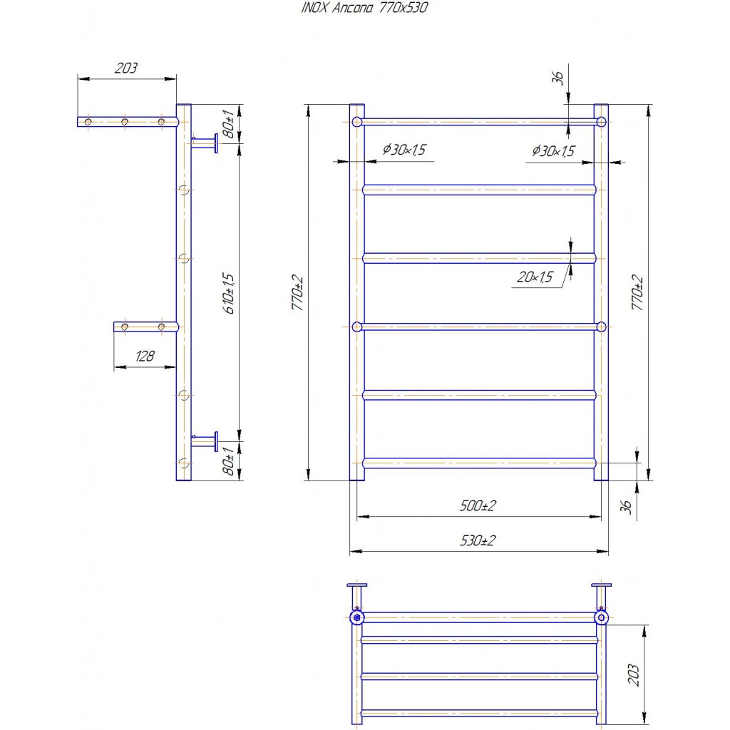 Полотенцесушитель INOX Анкона 770х530/500. Розміри: висота - 770 мм, ширина - 530 мм, глибина 260 мм, міжцентрова відстань для підключення - 500 мм, діаметр підключення G1/2''. Варіанти підключення: нижнє, діагональне та бічне. Количество ребер - 7. Виготовлена з полірованої нержавіючої сталі без хромування. Для всесезонної роботи водяну модель можна переобладнати на комбіновану, встановивши ТЕН, рекомендована потужність 300 Вт. Сумісні аксесуари: поворотні полиці та навісні гачки для збільшення функціональності. Рекомендовано підключати рушникосушарку за допомогою кранів Маріо. Гарантия - 50 років в закрытой системе отопления, 5 років у централізованій.