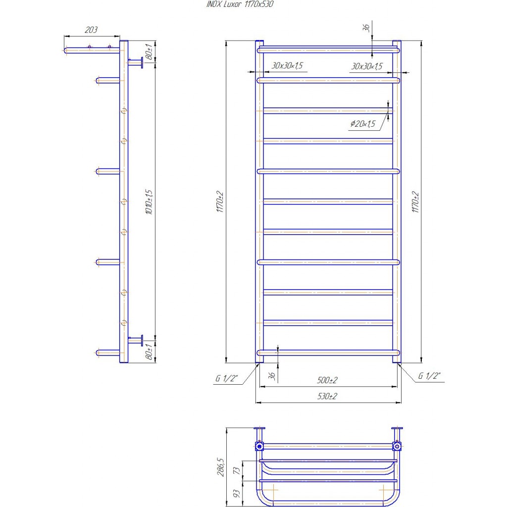 Полотенцесушитель INOX Луксор 1170х530/500. Розміри: висота - 1 170 мм, ширина - 530 мм, глибина 260 мм, міжцентрова відстань для підключення - 500 мм, діаметр підключення G1/2''. Варіанти підключення: нижнє, діагональне та бічне. Количество ребер - 11. Виготовлена з полірованої нержавіючої сталі без хромування. Для всесезонної роботи водяну модель можна переобладнати на комбіновану, встановивши ТЕН, рекомендована потужність 300 Вт. Сумісні аксесуари: поворотні полиці та навісні гачки для збільшення функціональності. Рекомендовано підключати рушникосушарку за допомогою кранів Маріо. Гарантия - 50 років в закрытой системе отопления, 5 років у централізованій.