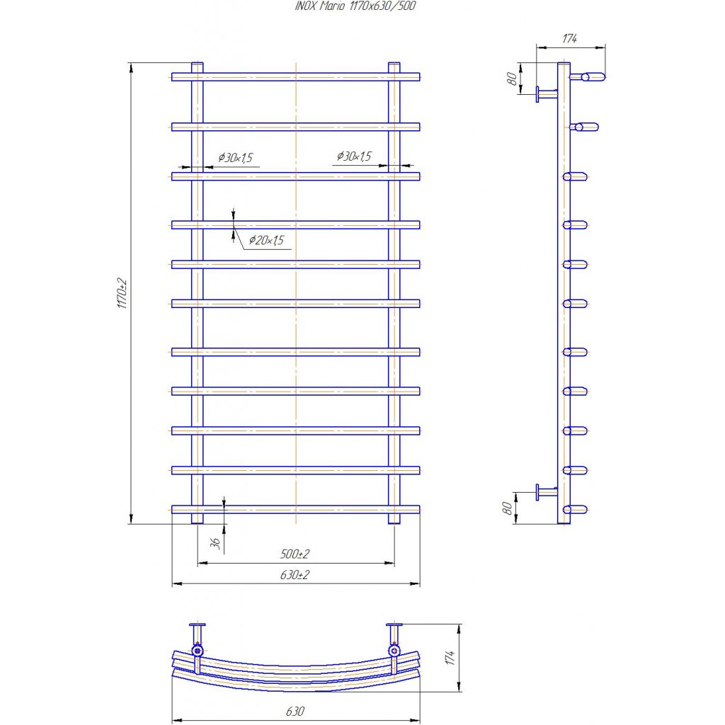 Полотенцесушитель INOX Марио 1170х630/500. Розміри: висота - 1 170 мм, ширина - 630 мм, глибина 170 мм, міжцентрова відстань для підключення - 500 мм, діаметр підключення G1/2''. Варіанти підключення: нижнє, діагональне та бічне. Количество ребер - 11. Виготовлена з полірованої нержавіючої сталі без хромування. Для всесезонної роботи водяну модель можна переобладнати на комбіновану, встановивши ТЕН, рекомендована потужність 600 Вт. Сумісні аксесуари: поворотні полиці та навісні гачки для збільшення функціональності. Рекомендовано підключати рушникосушарку за допомогою кранів Маріо. Гарантия - 50 років в закрытой системе отопления, 5 років у централізованій.