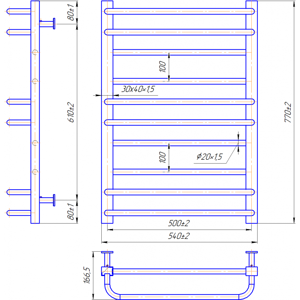 Водяной полотенцесушитель INOX Премиум Люкс 770х540/500. Размеры: высота - 770 мм, ширина - 540 мм, глубина 170 мм, межцентровое расстояние для подключения - 500 мм, диаметр подключения G1/2''. Варианты подключения: нижнее, диагональное и боковое. Количество ребер - 10. Изготовлена из полированной нержавеющей стали без хромирования. Для всесезонной работы водяную модель можно переоборудовать в комбинированную, установив ТЭН, рекомендуемая мощность 300 Вт. Совместимые аксессуары: поворотные полки и навесные крючки для увеличения функциональности. Рекомендуется подключать полотенцесушитель с помощью кранов Марио. Гарантия - 50 лет в закрытой системе отопления, 5 лет в централизованной.