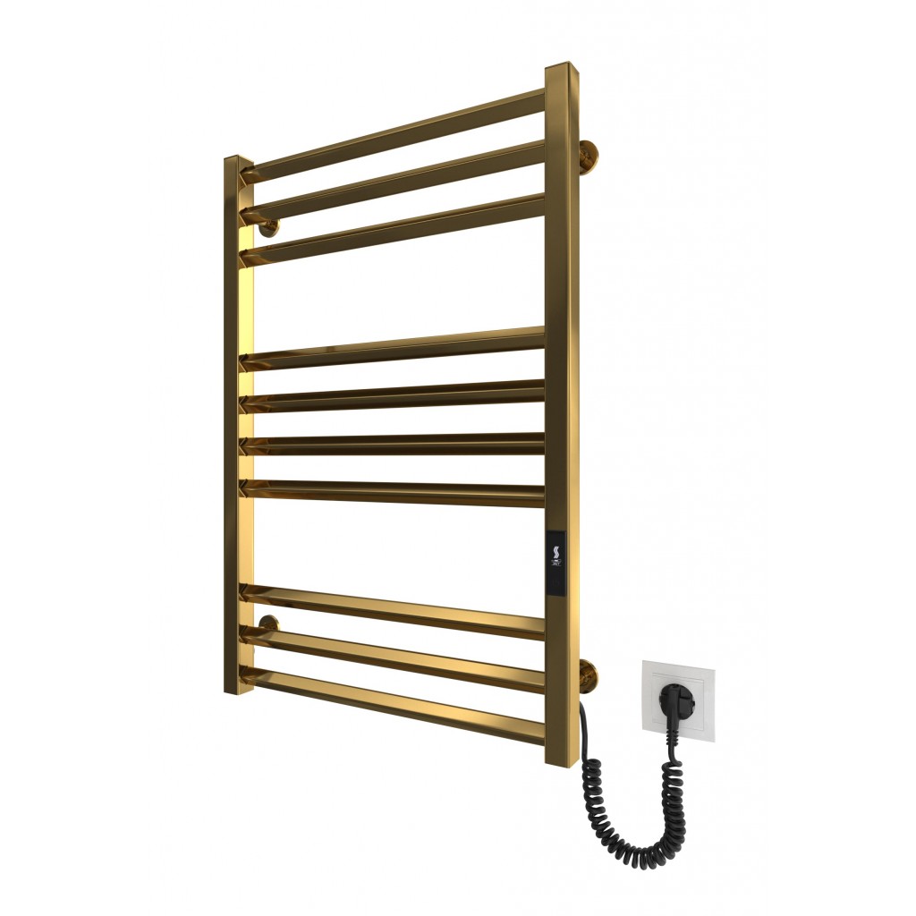 Бытовая электрическая полотенцесушилка Рушникосушка Кіото-I 770х530/80 TR К 2.0 золото. Оснащена таймер-регулятором и коннектором для подключения к розетке с любой стороны. Совместима с комплектом скрытого подключения. Имеет 10 перекладин и стойки. Изготовлена из полированной нержавеющей стали без хромирования. Температурные режимы таймер-регулятора: 40°С, 45°С, 50°С. Варианты времени работы: 3, 6 часов и постоянный нагрев. Мощность [3 Вт]. Для удобства использования можно дополнительно оснастить навесными крючками. Гарантия — .