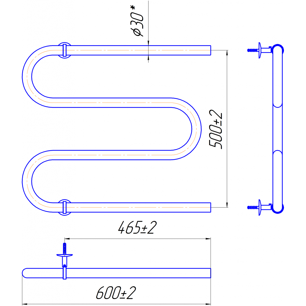 рушникосушка - 1шт. комплект кріплень - 1шт. кран Маєвського - 1 шт. заглушка - 1шт. паспорт - 1шт. коробка - 1шт.| Розміри | 530x600 |