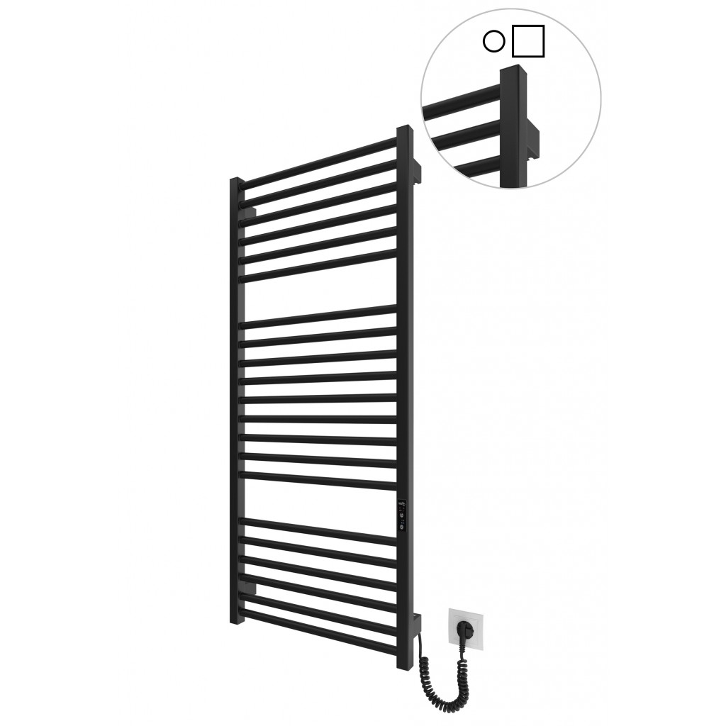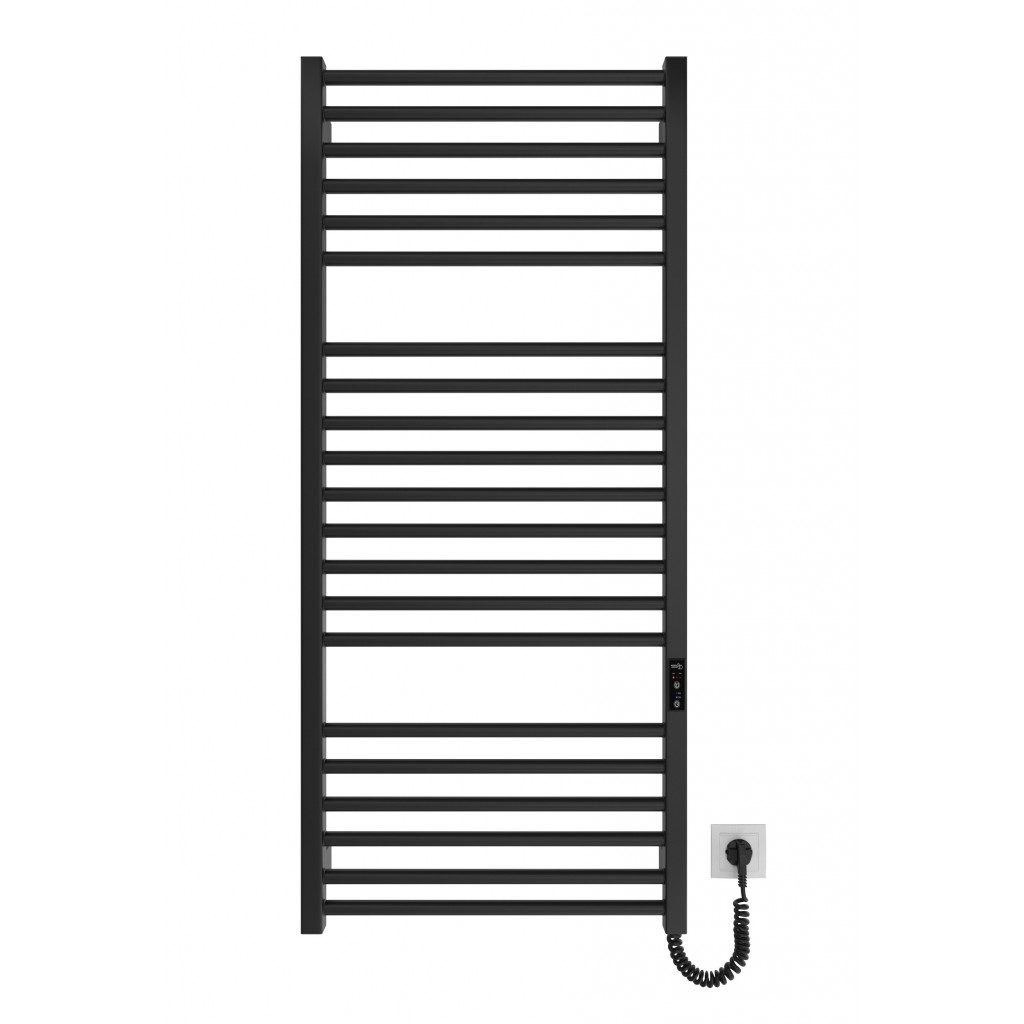 Електрична рушникосушарка HF Derby 1170x530. Працює за технологією сухого ТЕНу. Обладнана вбудованим таймер-регулятором і конектором для підключення до живлення з будь-якого боку. Оснащена комплектом для прихованого підключення. Модель має 21 ребро з круглої труби та стійки з квадратного профілю. Матеріал - чорна сталь з антикорозійною обробкою. Варіанти покриття: чорний мат або білий мат. Температурні режими таймер-регулятора: 40°С, 45°С, 50°С. Час роботи: 3, 6 годин або постійний нагрів. Потужність 240 Вт. Гарантія - 3 роки.