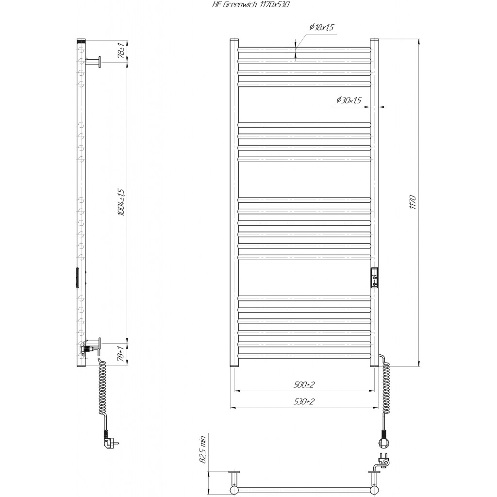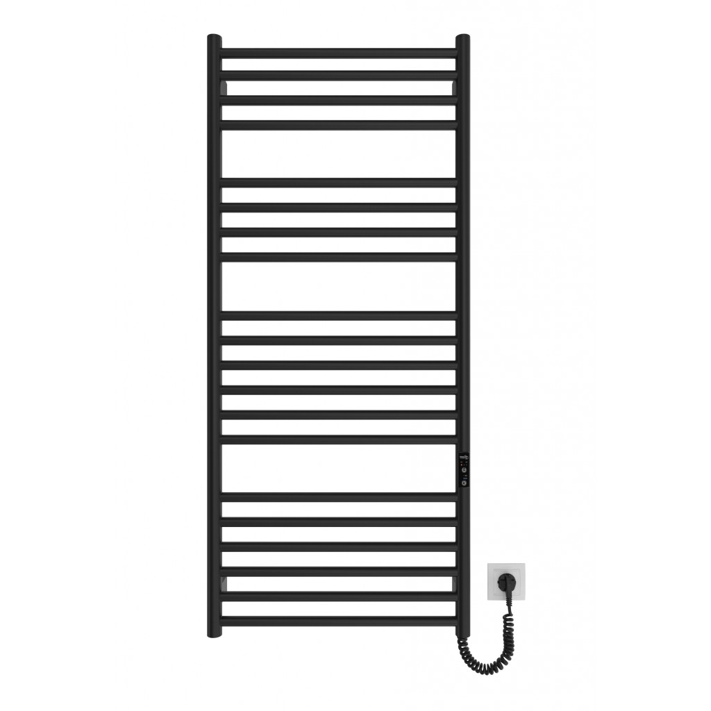 Електрична рушникосушарка HF Greenwich 1170х530. Працює за технологією сухого ТЕНу. Обладнана вбудованим таймер-регулятором і конектором для підключення до живлення з будь-якого боку. Оснащена комплектом для прихованого підключення. Модель має 20 ребро з круглої труби та стійки з круглої труби. Матеріал - чорна сталь з антикорозійною обробкою. Варіанти покриття: чорний мат або білий мат. Температурні режими таймер-регулятора: 40°С, 45°С, 50°С. Час роботи: 3, 6 годин або постійний нагрів. Потужність 190 Вт. Гарантія - 3 роки.