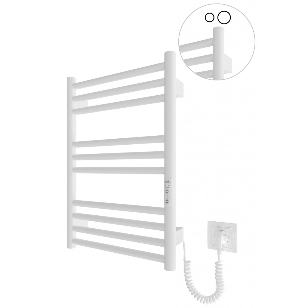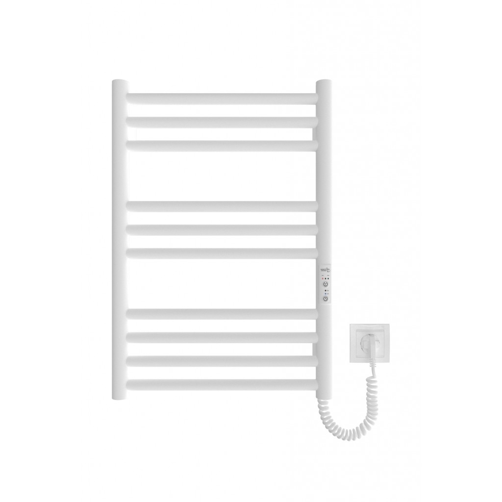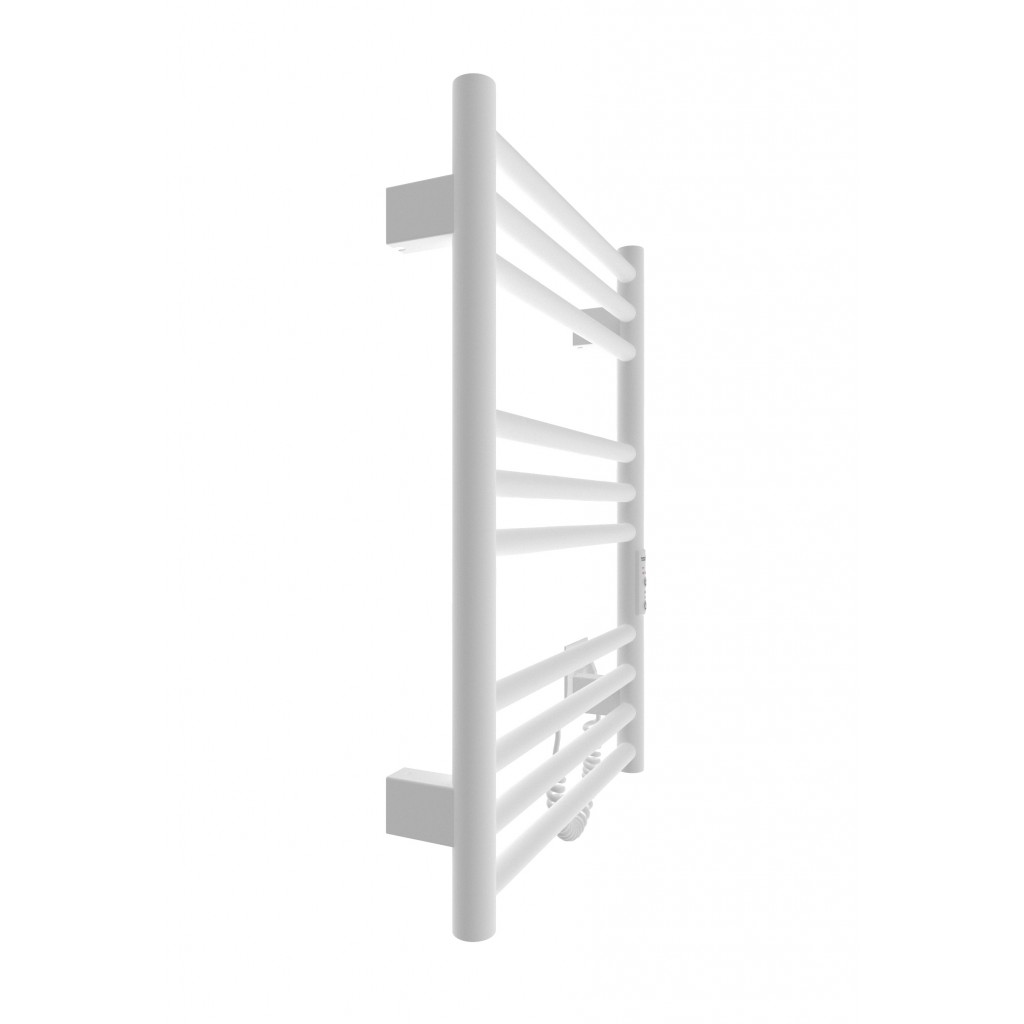 Електрична рушникосушарка HF Greenwich 570x430. Працює за технологією сухого ТЕНу. Обладнана вбудованим таймер-регулятором і конектором для підключення до живлення з будь-якого боку. Оснащена комплектом для прихованого підключення. Модель має 10 ребро з круглої труби та стійки з круглої труби. Матеріал - чорна сталь з антикорозійною обробкою. Варіанти покриття: чорний мат або білий мат. Температурні режими таймер-регулятора: 40°С, 45°С, 50°С. Час роботи: 3, 6 годин або постійний нагрів. Потужність 90 Вт. Гарантія - 3 роки.