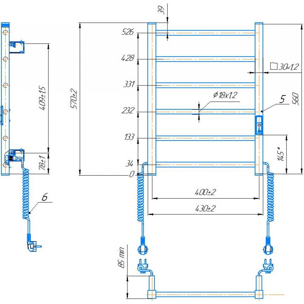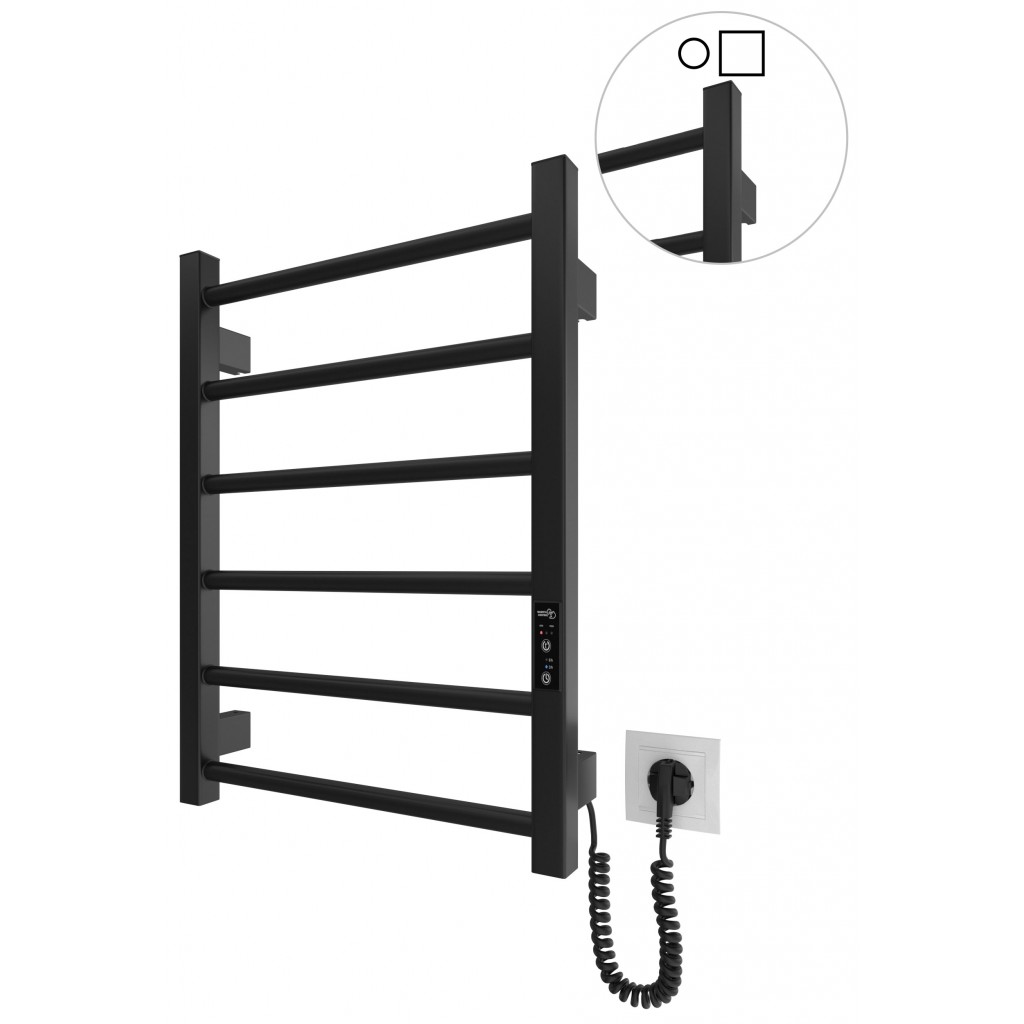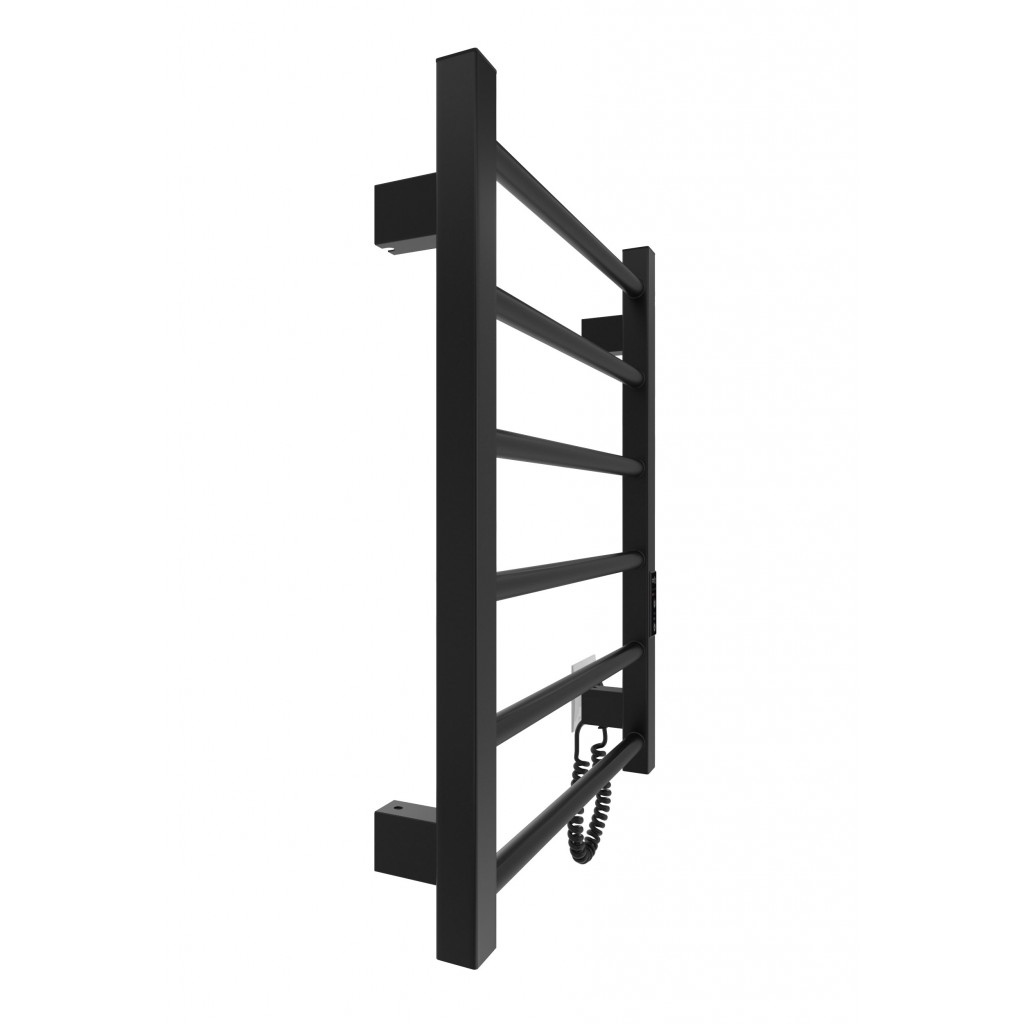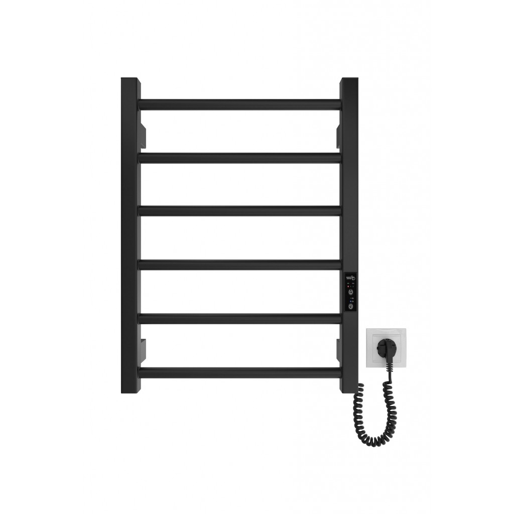 Електрична рушникосушарка HF Leeds 570x430. Працює за технологією сухого ТЕНу. Обладнана вбудованим таймер-регулятором і конектором для підключення до живлення з будь-якого боку. Оснащена комплектом для прихованого підключення. Модель має 6 ребер з круглої труби та стійки з квадратного профілю. Матеріал - чорна сталь з антикорозійною обробкою. Варіанти покриття: чорний мат або білий мат. Температурні режими таймер-регулятора: 40°С, 45°С, 50°С. Час роботи: 3, 6 годин або постійний нагрів. Потужність 60 Вт. Гарантія - 3 роки