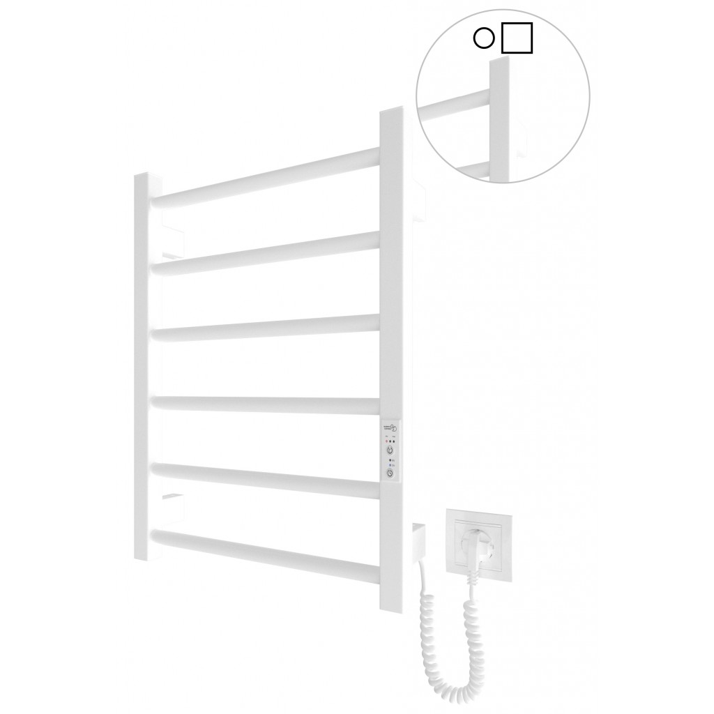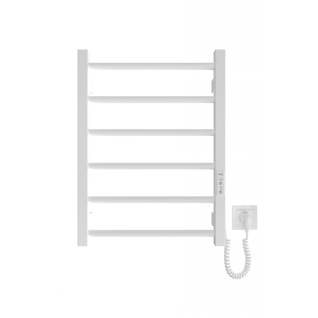 Електрична рушникосушарка HF Leeds 570x430. Працює за технологією сухого ТЕНу. Обладнана вбудованим таймер-регулятором і конектором для підключення до живлення з будь-якого боку. Оснащена комплектом для прихованого підключення. Модель має 6 ребер з круглої труби та стійки з квадратного профілю. Матеріал - чорна сталь з антикорозійною обробкою. Варіанти покриття: чорний мат або білий мат. Температурні режими таймер-регулятора: 40°С, 45°С, 50°С. Час роботи: 3, 6 годин або постійний нагрів. Потужність 60 Вт. Гарантія - 3 роки