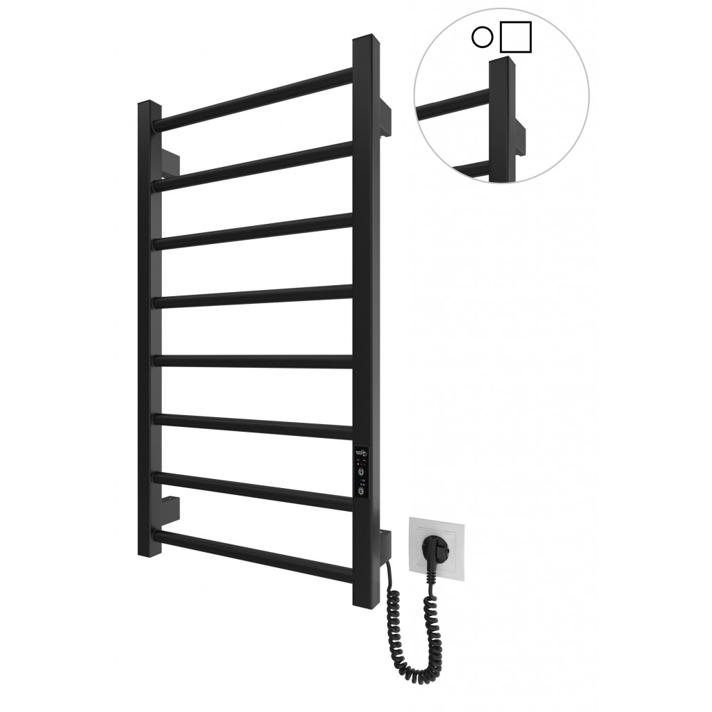 Електрична рушникосушарка HF Leeds 770x430. Працює за технологією сухого ТЕНу. Обладнана вбудованим таймер-регулятором і конектором для підключення до живлення з будь-якого боку. Оснащена комплектом для прихованого підключення. Модель має 8 ребер з круглої труби та стійки з квадратного профілю. Матеріал - чорна сталь з антикорозійною обробкою. Варіанти покриття: чорний мат або білий мат. Температурні режими таймер-регулятора: 40°С, 45°С, 50°С. Час роботи: 3, 6 годин або постійний нагрів. Потужність 100 Вт. Гарантія - 3 роки