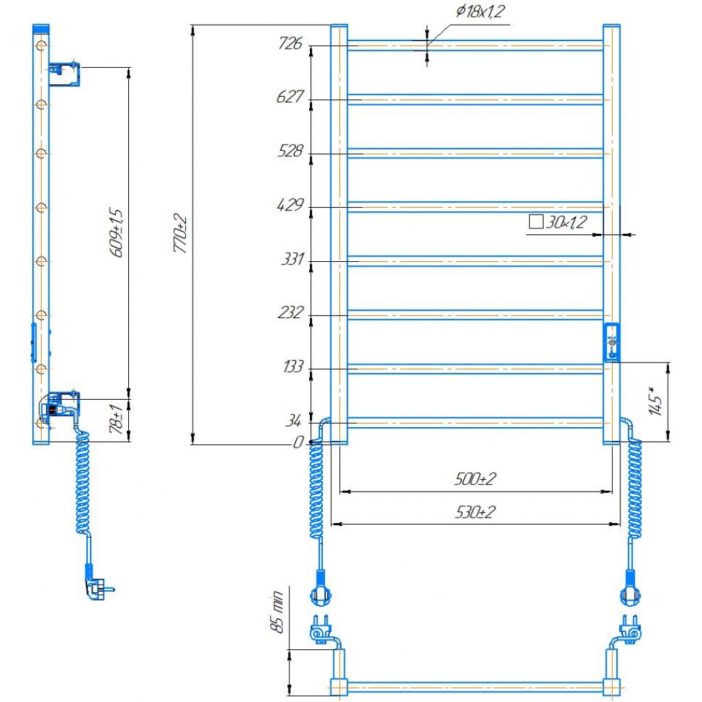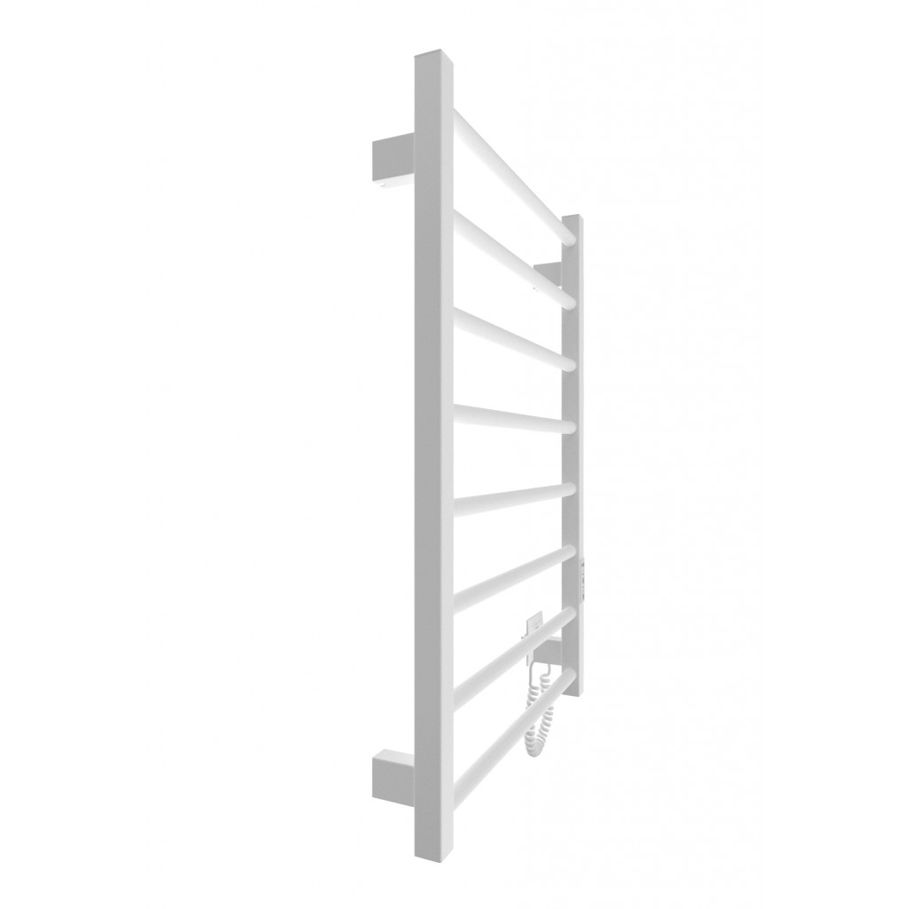 Електрична рушникосушарка HF Leeds 770x530. Працює за технологією сухого ТЕНу. Обладнана вбудованим таймер-регулятором і конектором для підключення до живлення з будь-якого боку. Оснащена комплектом для прихованого підключення. Модель має 8 ребер з круглої труби та стійки з квадратного профілю. Матеріал - чорна сталь з антикорозійною обробкою. Варіанти покриття: чорний мат або білий мат. Температурні режими таймер-регулятора: 40°С, 45°С, 50°С. Час роботи: 3, 6 годин або постійний нагрів. Потужність 110 Вт. Гарантія - 3 роки