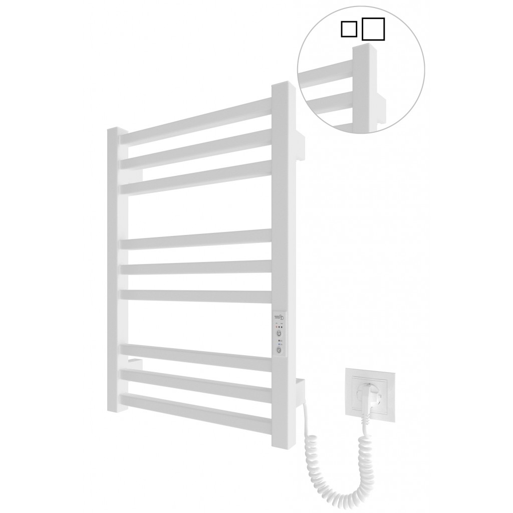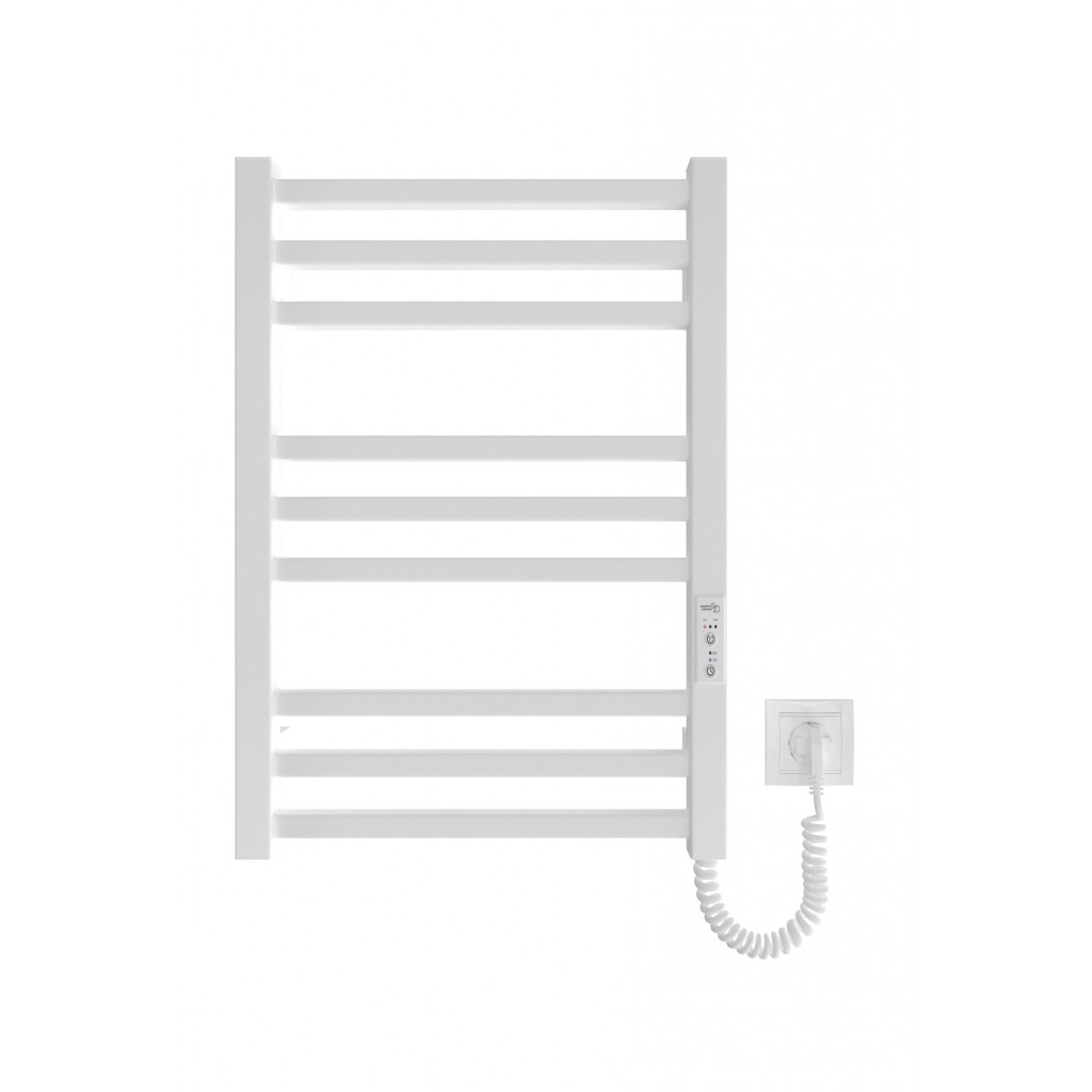 Електрична рушникосушарка HF London 570x430. Працює за технологією сухого ТЕНу. Обладнана вбудованим таймер-регулятором і конектором для підключення до живлення з будь-якого боку. Оснащена комплектом для прихованого підключення. Модель має 9 ребр з квадратної труби та стійки з квадратної труби. Матеріал - чорна сталь з антикорозійною обробкою(фосфотація). Варіанти покриття: чорний мат або білий мат. Температурні режими таймер-регулятора: 40°С, 45°С, 50°С. Час роботи: 3, 6 годин або постійний нагрів. Потужність 95 Вт. Гарантія - 3 роки.