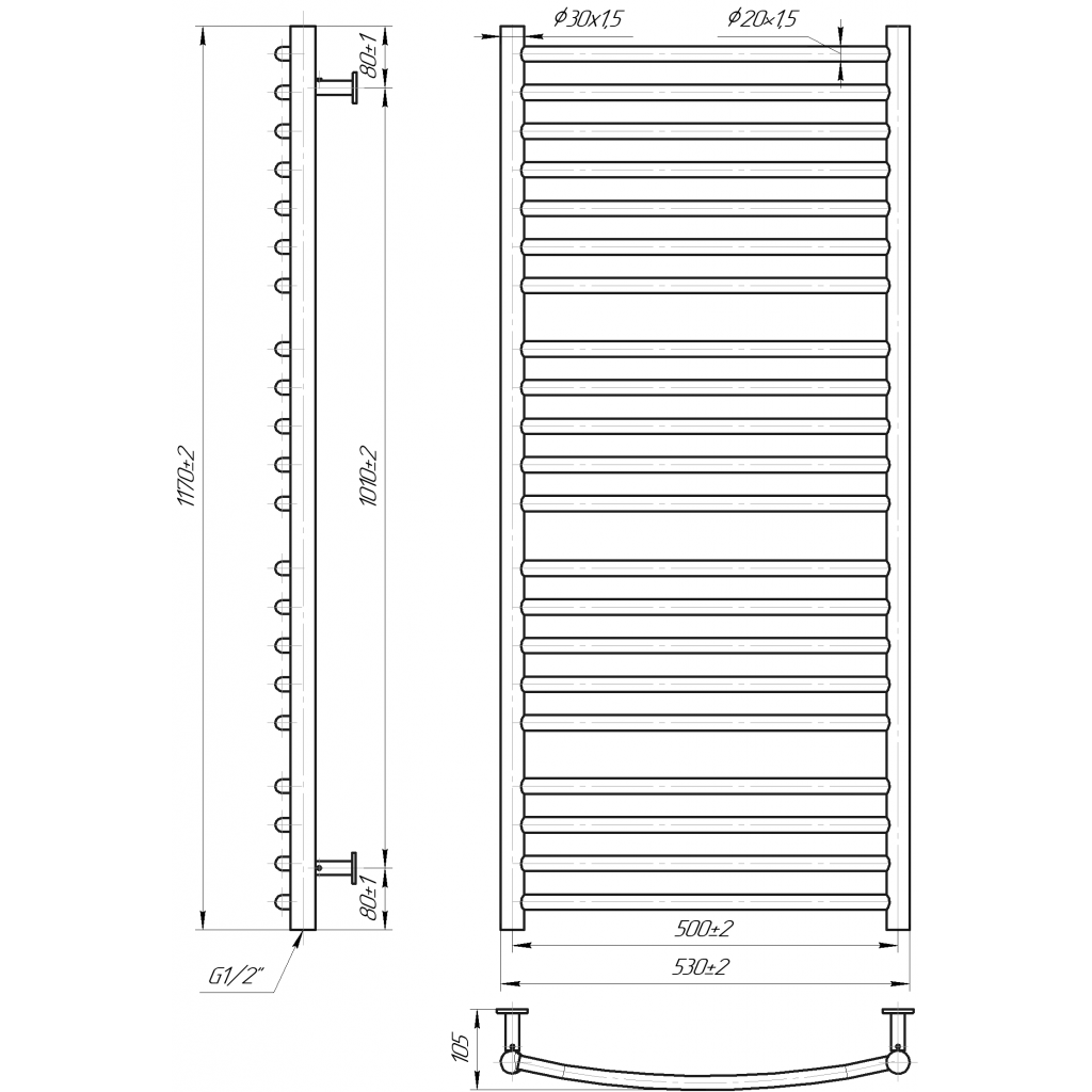 рушникосушка - 1шт. комплект кріплень - 1шт. кран Маєвського - 1 шт. заглушка - 1шт. паспорт - 1шт. коробка - 1шт.Розміри | 1170x530 |