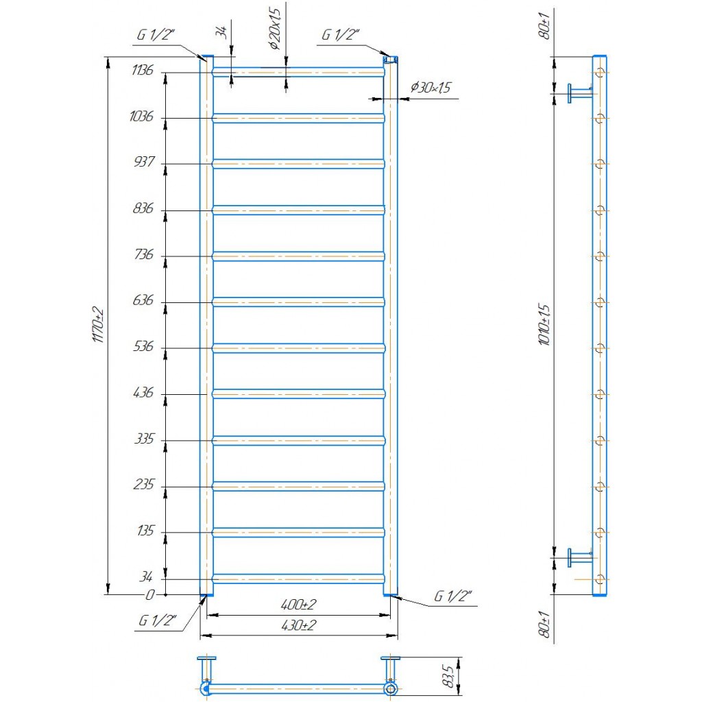 Рушникосушарка INOX Флет 1170х430/400. Розміри: висота - 1 170 мм, ширина - 430 мм, глибина 80 мм, міжцентрова відстань для підключення - 400 мм, діаметр підключення G1/2''. Варіанти підключення: нижнє, діагональне та бічне. Кількість ребер - 12. Виготовлена з полірованої нержавіючої сталі без хромування. Для всесезонної роботи водяну модель можна переобладнати на комбіновану, встановивши ТЕН, рекомендована потужність 300 Вт. Сумісні аксесуари: поворотні полиці та навісні гачки для збільшення функціональності. Рекомендовано підключати рушникосушарку за допомогою кранів Маріо. Гарантія - 50 років в закритій системі опалення, 5 років у централізованій.