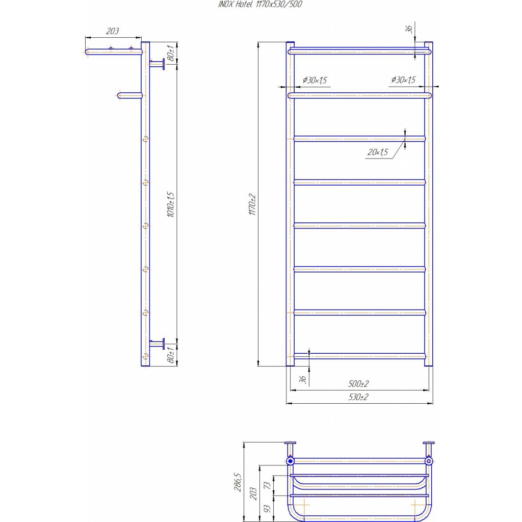 Рушникосушарка INOX Готель 1170х530/500. Розміри: висота - 1 170 мм, ширина - 530 мм, глибина 260 мм, міжцентрова відстань для підключення - 500 мм, діаметр підключення G1/2''. Варіанти підключення: нижнє, діагональне та бічне. Кількість ребер - 8. Виготовлена з полірованої нержавіючої сталі без хромування. Для всесезонної роботи водяну модель можна переобладнати на комбіновану, встановивши ТЕН, рекомендована потужність 600 Вт. Сумісні аксесуари: поворотні полиці та навісні гачки для збільшення функціональності. Рекомендовано підключати рушникосушарку за допомогою кранів Маріо. Гарантія - 50 років в закритій системі опалення, 5 років у централізованій.