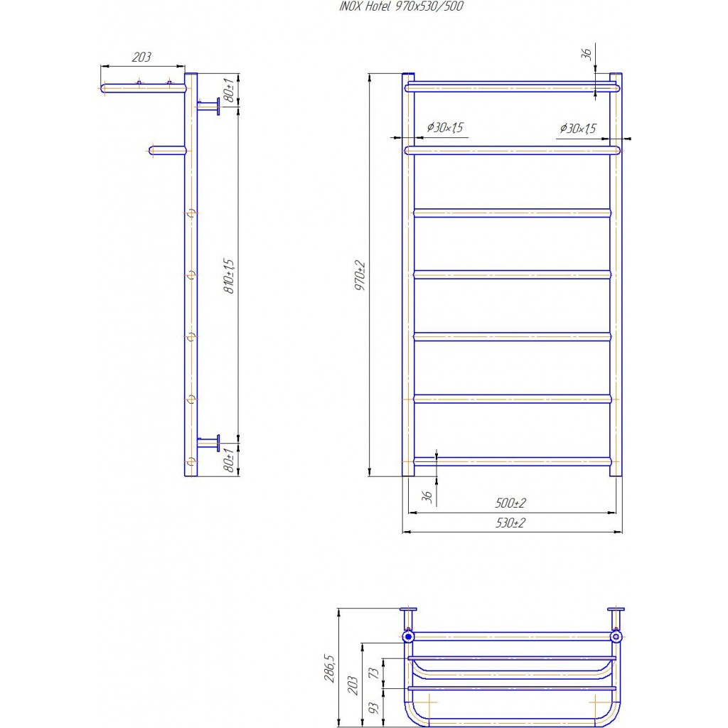 Рушникосушарка INOX Готель 970х530/500. Розміри: висота - 970 мм, ширина - 530 мм, глибина 260 мм, міжцентрова відстань для підключення - 500 мм, діаметр підключення G1/2''. Варіанти підключення: нижнє, діагональне та бічне. Кількість ребер - 7. Виготовлена з полірованої нержавіючої сталі без хромування. Для всесезонної роботи водяну модель можна переобладнати на комбіновану, встановивши ТЕН, рекомендована потужність 300 Вт. Сумісні аксесуари: поворотні полиці та навісні гачки для збільшення функціональності. Рекомендовано підключати рушникосушарку за допомогою кранів Маріо. Гарантія - 50 років в закритій системі опалення, 5 років у централізованій.