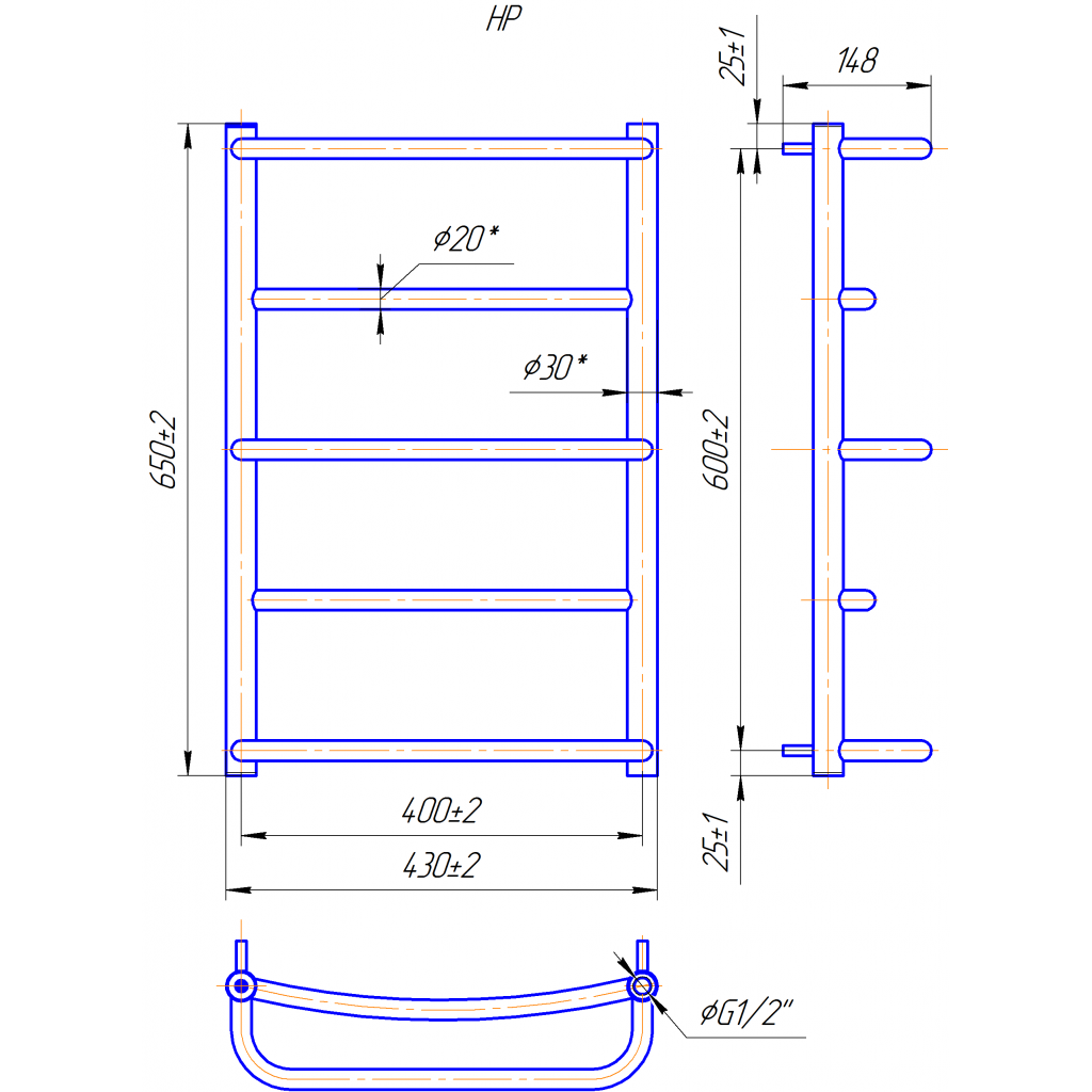 Рушникосушарка "Маріо" Люкс HP 650х430/400. Розміри: висота - 650 мм, ширина - 430 мм, глибина 170 мм, міжцентрова відстань для підключення - 400 мм, діаметр підключення G1/2''. Приставка HP (Heat Point) - лінійка водяних та електричних рушникосушарок економ-сегменту. Єдиною відмінністю є менша кількість перемичок порівняно з виробами стандартного або преміум сегмента. Варіанти підключення: нижнє, діагональне та бічне. Кількість ребер - 5, стояки з круглої труби. Виготовлена з полірованої нержавіючої сталі без хромування. Варіанти покриття: полірована або сатин, чорний мат, білий глянець, золото, бронза. Для всесезонної роботи водяну модель можна переобладнати на комбіновану, встановивши ТЕН, рекомендована потужність 120 Вт. Сумісні аксесуари: поворотні полиці та навісні гачки для збільшення функціональності. Рекомендовано підключати рушникосушарку за допомогою кранів Маріо. Гарантія - 50 років в закритій системі опалення, 5 років у централізованій.
