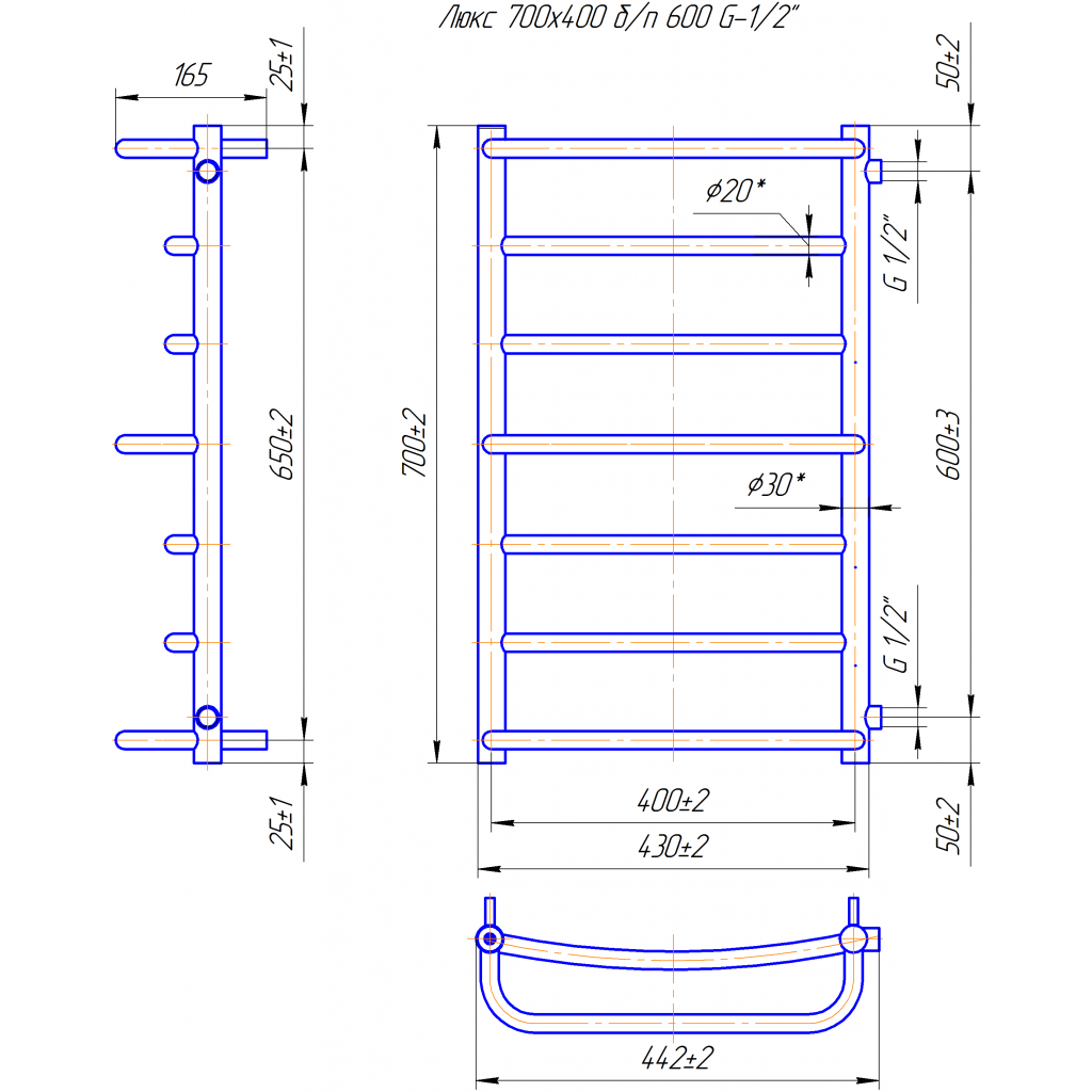 Водяна рушникосушарка Люкс Б/П 1/2" 700х450 з міжцентровою відстанню для підключення 600мм, діаметр підключення G 1/2'' складається з 7 ребер. Рушникосушарка Люкс Б/П 1/2" заводу виробника Mario виготовлена з нержавіючої сталі АІSI 304. Є можливість ⟳перевернути на 180° ; дзеркально відобразивши (справа наліво і лівосторонні перемички)