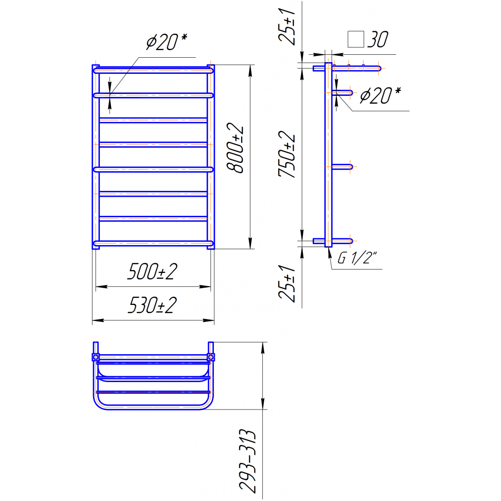 Розміри: висота - 800 мм, ширина - 530 мм, глибина 295 мм, міжцентрова відстань для підключення - 500 мм, діаметр підключення G1/2''.