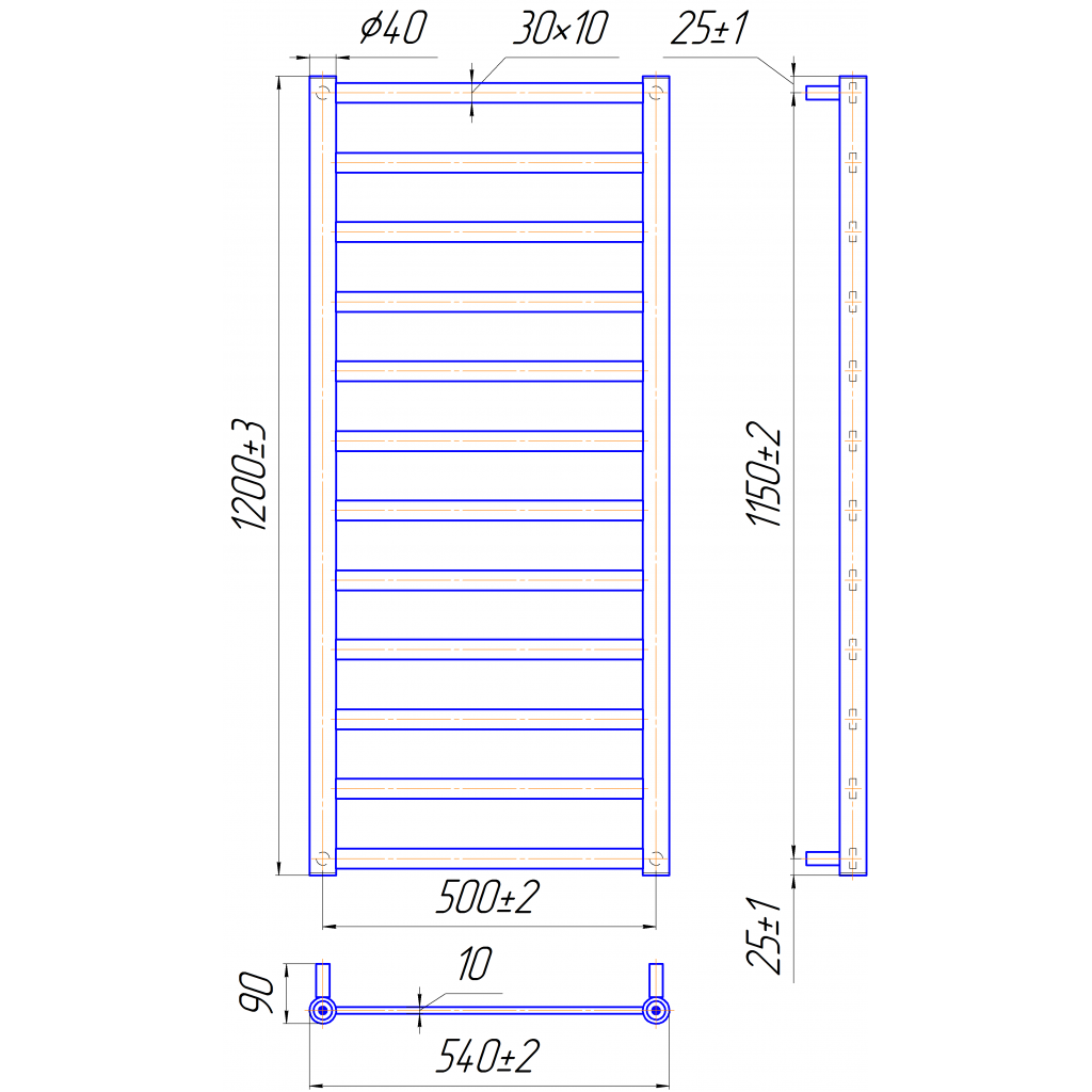 Розміри: висота - 1200 мм, ширина - 540 мм, глибина 90 мм, міжцентрова відстань для підключення - 500 мм, діаметр підключення G1/2''.