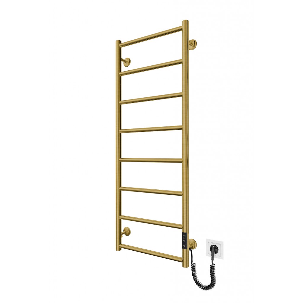 Бытовая электрическая полотенцесушилка Рушникосушка Класік F НР-I 1090х430/75 TR K золото сатин. Оснащена таймер-регулятором и коннектором для подключения к розетке с любой стороны. Совместима с комплектом скрытого подключения. Имеет 8 перекладин и стойки. Изготовлена из полированной нержавеющей стали без хромирования. Температурные режимы таймер-регулятора: 40°С, 45°С, 50°С. Варианты времени работы: 3, 6 часов и постоянный нагрев. Мощность [3 Вт]. Для удобства использования можно дополнительно оснастить навесными крючками. Гарантия — .