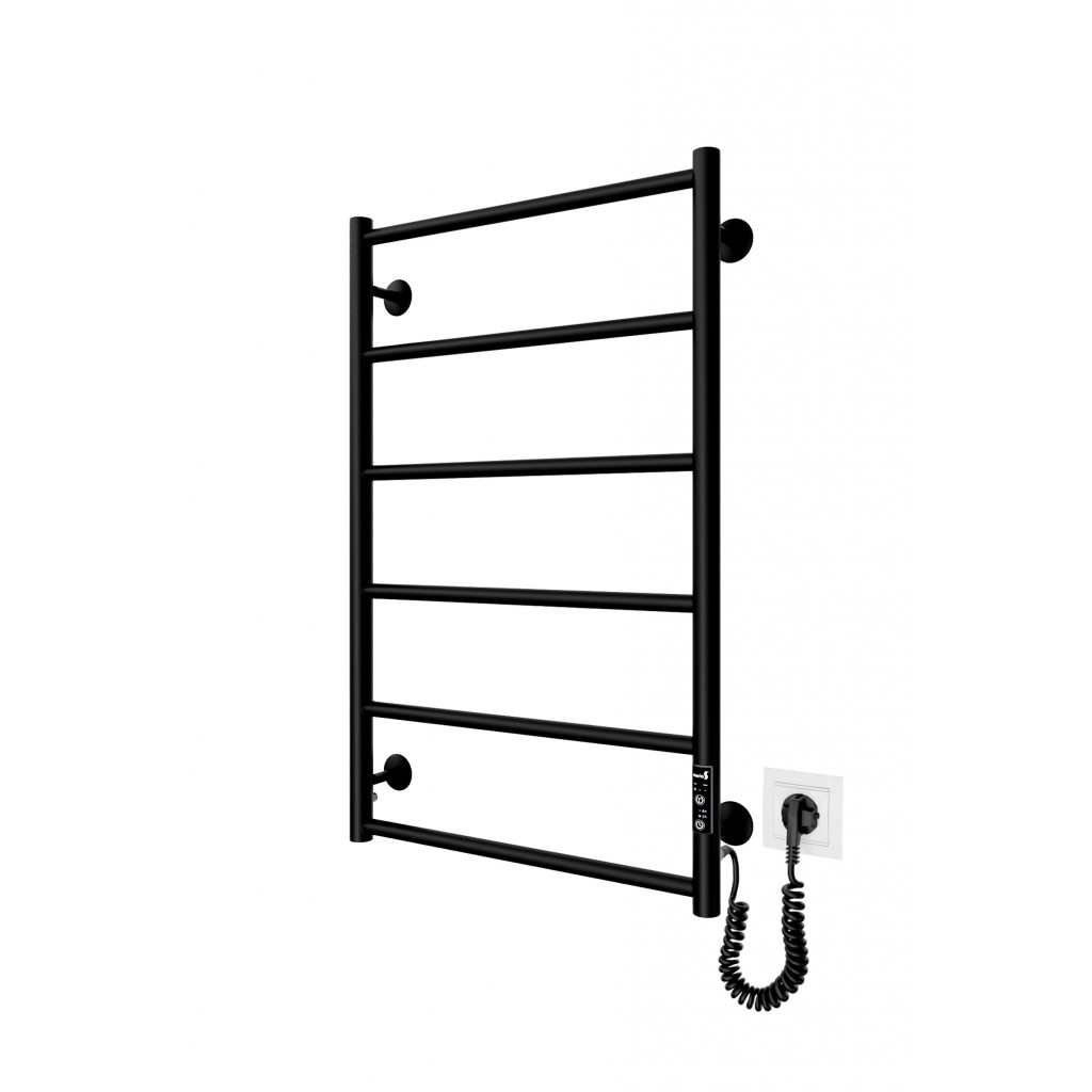 Бытовая электрическая полотенцесушилка Рушникосушка Класік F НР-I 800х530/75 TR K чорний мат. Оснащена таймер-регулятором и коннектором для подключения к розетке с любой стороны. Совместима с комплектом скрытого подключения. Имеет 6 перекладин и стойки. Изготовлена из полированной нержавеющей стали без хромирования. Температурные режимы таймер-регулятора: 40°С, 45°С, 50°С. Варианты времени работы: 3, 6 часов и постоянный нагрев. Мощность [3 Вт]. Для удобства использования можно дополнительно оснастить навесными крючками. Гарантия — .