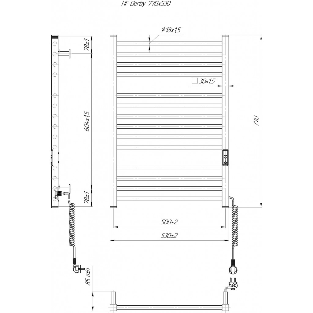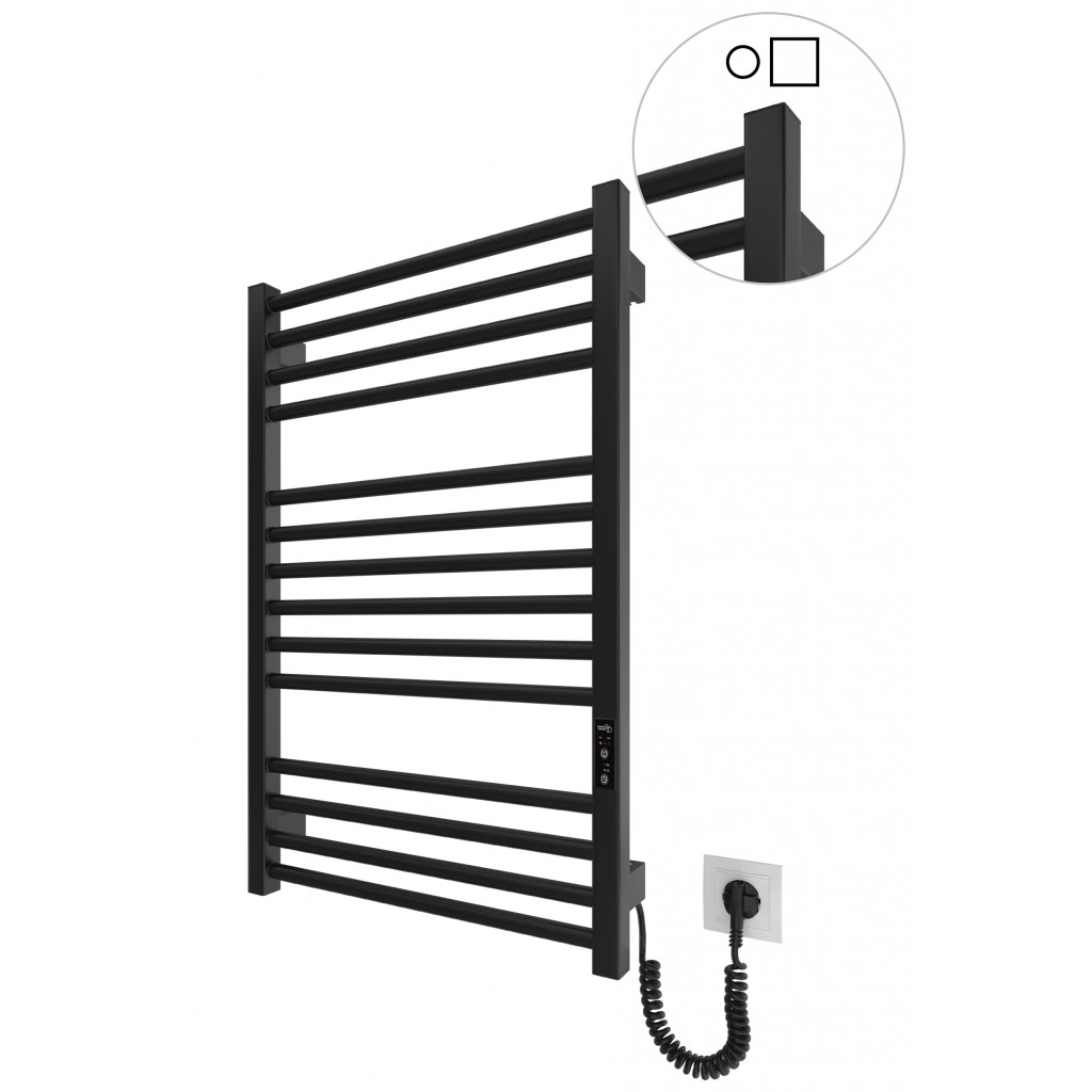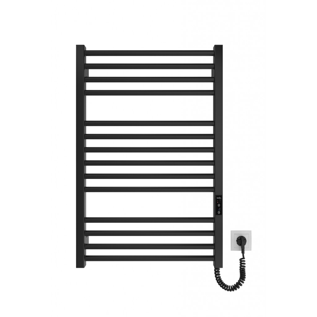 Электрический полотенцесушитель HF Derby 770x530. Работает по технологии сухого ТЭНа. Оборудован встроенным таймер-регулятором и коннектором для подключения к питанию с любой стороны. Оснащен комплектом для скрытого подключения. Модель имеет 14 ребер из круглой трубы и стойки из квадратного профиля. Материал - черная сталь с антикоррозийной обработкой. Варианты покрытия: черный мат или белый мат. Температурные режимы таймер-регулятора: 40°С, 45°С, 50°С. Время работы: 3, 6 часов или постоянный нагрев. Мощность 145 Вт. Гарантия - 3 года.