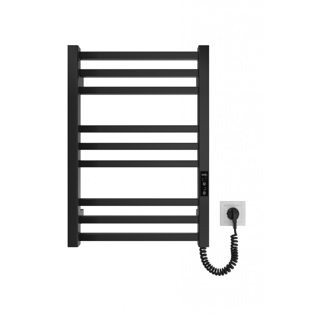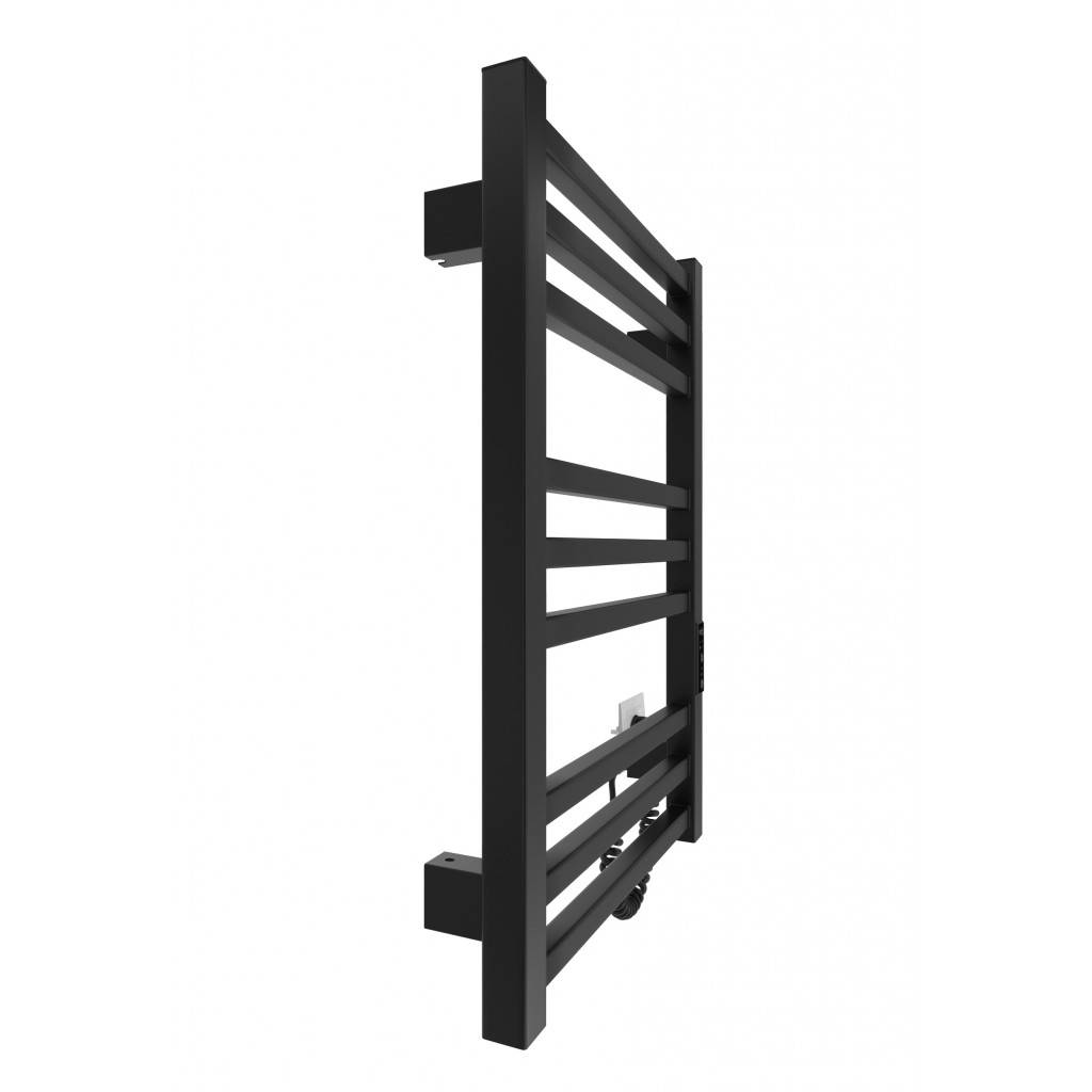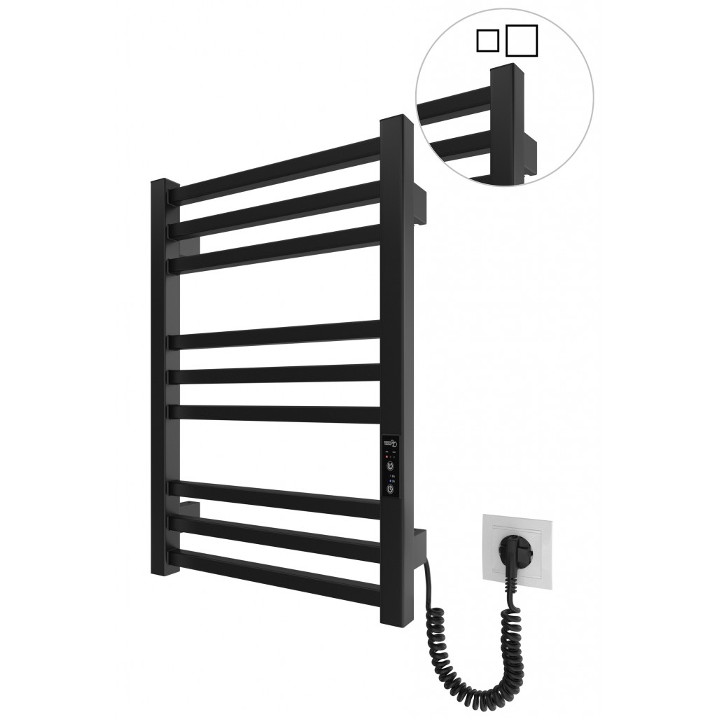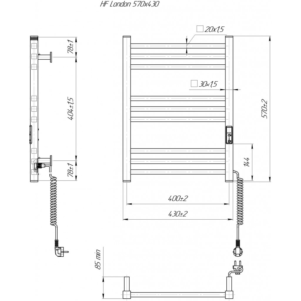 Электрический полотенцесушитель HF London 570x430. Работает по технологии сухого ТЭНа. Оборудован встроенным таймер-регулятором и коннектором для подключения к питанию с любой стороны. Оснащен комплектом для скрытого подключения. Модель имеет 9 ребер из квадратной трубы и стойки из квадратной трубы. Материал - черная сталь с антикоррозийной обработкой. Варианты покрытия: черный мат или белый мат. Температурные режимы таймер-регулятора: 40°С, 45°С, 50°С. Время работы: 3, 6 часов или постоянный нагрев. Мощность 95 Вт. Гарантия - 3 года.