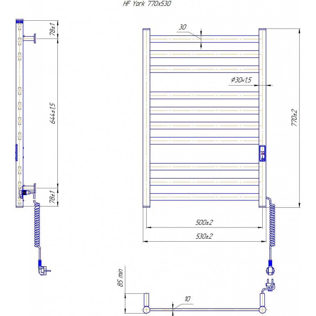 Электрический полотенцесушитель HF York 770х530. Работает по технологии сухого ТЭНа. Оборудован встроенным таймер-регулятором и коннектором для подключения к питанию с любой стороны. Оснащен комплектом для скрытого подключения. Модель имеет 10 ребер из прямокутной трубы и стойки из круглой трубы. Материал - черная сталь с антикоррозийной обработкой. Варианты покрытия: черный мат или белый мат. Температурные режимы таймер-регулятора: 40°С, 45°С, 50°С. Время работы: 3, 6 часов или постоянный нагрев. Мощность 130 Вт. Гарантия - 3 года.