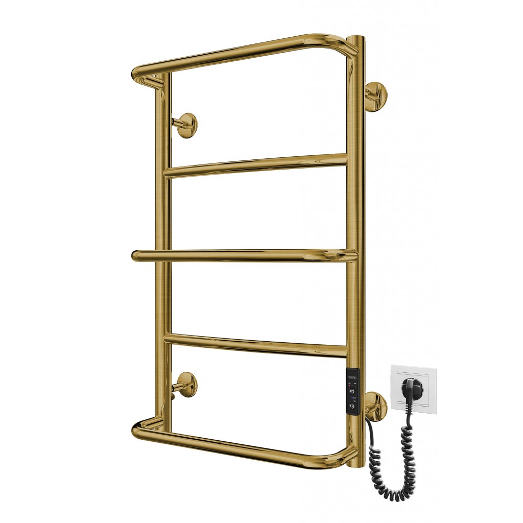 Бытовая электрическая полотенцесушилка Рушникосушка Люкс НР-І 650х430/150 електр. TR К золото сатин. Оснащена таймер-регулятором и коннектором для подключения к розетке с любой стороны. Совместима с комплектом скрытого подключения. Имеет 5 перекладин и стойки. Изготовлена из полированной нержавеющей стали без хромирования. Температурные режимы таймер-регулятора: 40°С, 45°С, 50°С. Варианты времени работы: 3, 6 часов и постоянный нагрев. Мощность [3 Вт]. Для удобства использования можно дополнительно оснастить навесными крючками. Гарантия — .