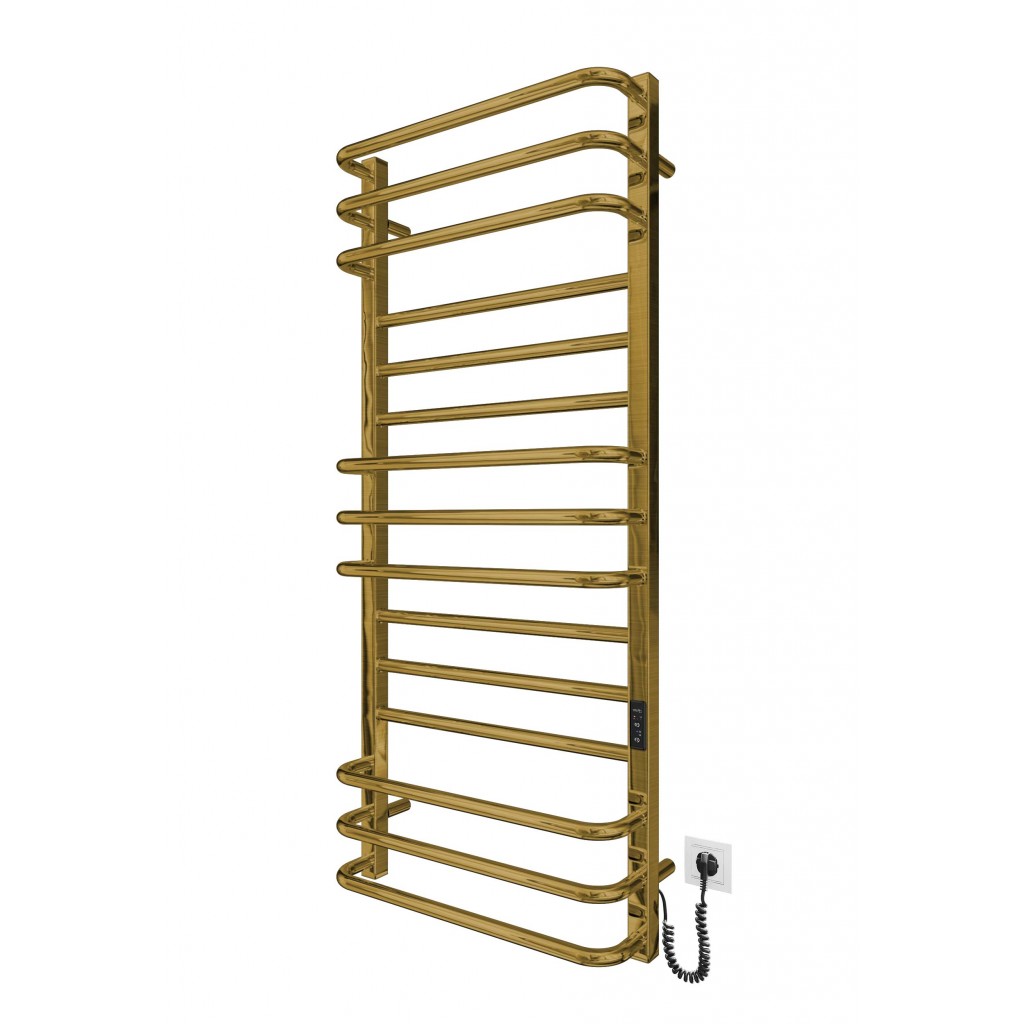 Бытовая электрическая полотенцесушилка Рушникосушка Преміум Люкс-I 1100х500/170 електр. TR К золото сатин. Оснащена таймер-регулятором и коннектором для подключения к розетке с любой стороны. Совместима с комплектом скрытого подключения. Имеет 13 перекладин и стойки. Изготовлена из полированной нержавеющей стали без хромирования. Температурные режимы таймер-регулятора: 40°С, 45°С, 50°С. Варианты времени работы: 3, 6 часов и постоянный нагрев. Мощность [3 Вт]. Для удобства использования можно дополнительно оснастить навесными крючками. Гарантия — .