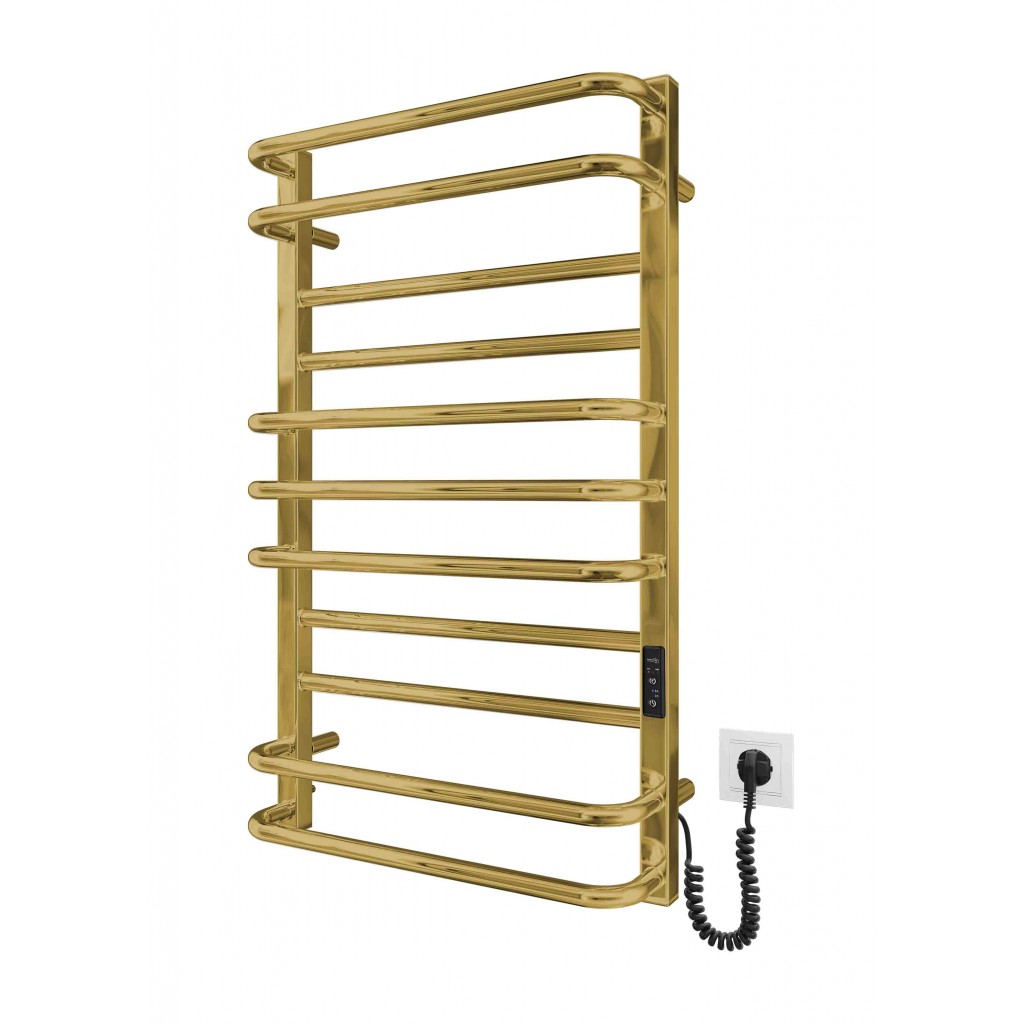 Бытовая электрическая полотенцесушилка Рушникосушка Преміум Люкс-I 800х500/170 електр. TR К золото. Оснащена таймер-регулятором и коннектором для подключения к розетке с любой стороны. Совместима с комплектом скрытого подключения. Имеет 11 перекладин и стойки. Изготовлена из полированной нержавеющей стали без хромирования. Температурные режимы таймер-регулятора: 40°С, 45°С, 50°С. Варианты времени работы: 3, 6 часов и постоянный нагрев. Мощность [3 Вт]. Для удобства использования можно дополнительно оснастить навесными крючками. Гарантия — .