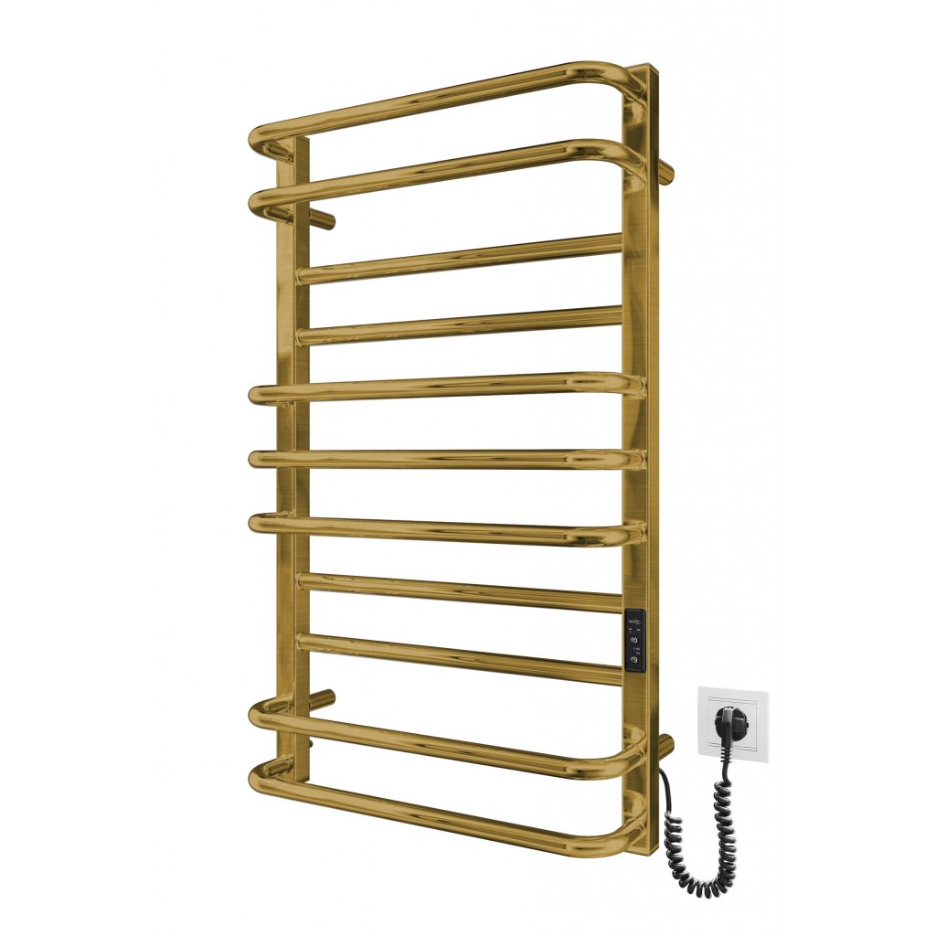 Бытовая электрическая полотенцесушилка Рушникосушка Преміум Люкс-I 800х500/170 електр. TR К золото сатин. Оснащена таймер-регулятором и коннектором для подключения к розетке с любой стороны. Совместима с комплектом скрытого подключения. Имеет 10 перекладин и стойки. Изготовлена из полированной нержавеющей стали без хромирования. Температурные режимы таймер-регулятора: 40°С, 45°С, 50°С. Варианты времени работы: 3, 6 часов и постоянный нагрев. Мощность [3 Вт]. Для удобства использования можно дополнительно оснастить навесными крючками. Гарантия — .