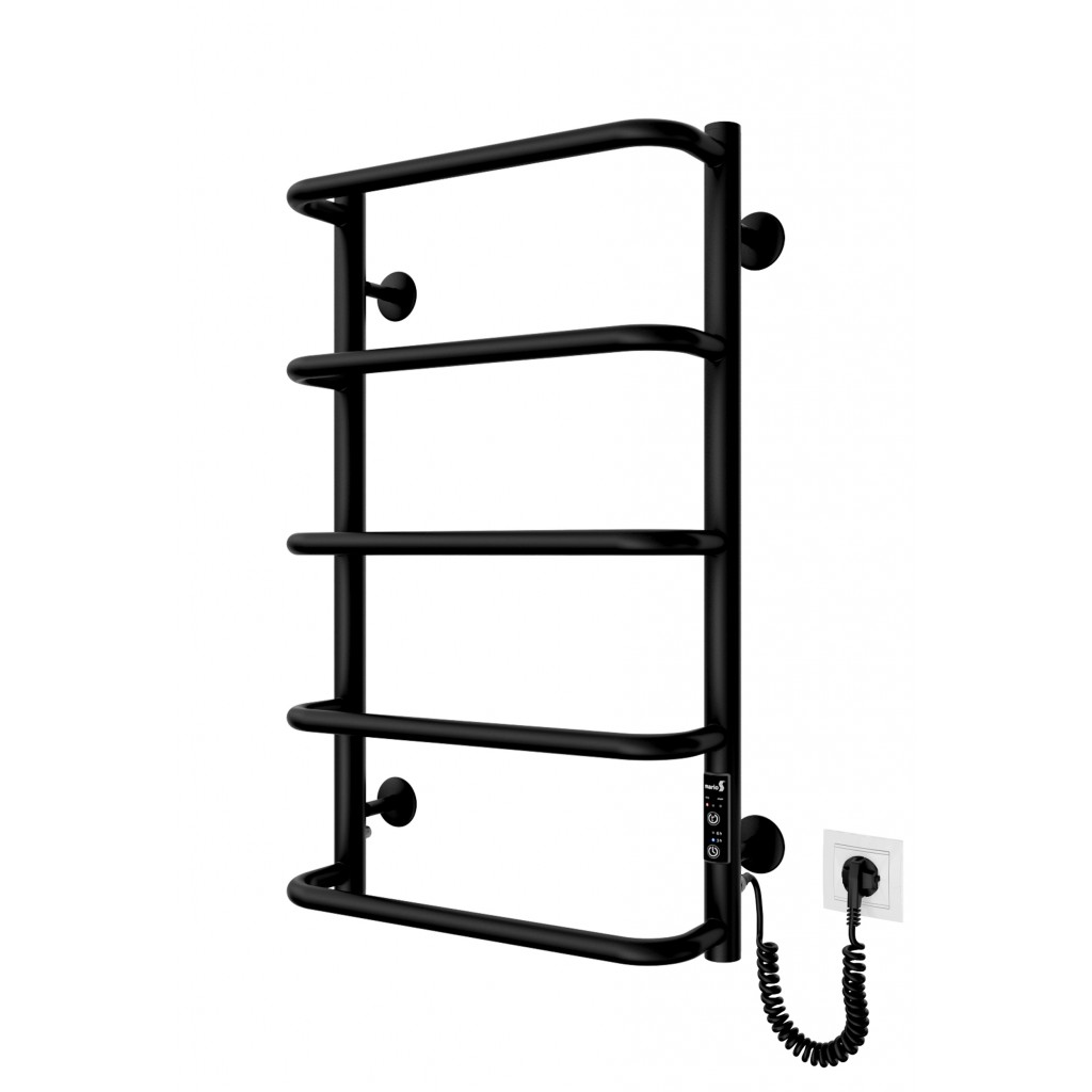 Бытовая электрическая полотенцесушилка Рушникосушка Стандарт НР-І 650х430/150 електр. TR К чорний мат. Оснащена таймер-регулятором и коннектором для подключения к розетке с любой стороны. Совместима с комплектом скрытого подключения. Имеет 5 перекладин и стойки. Изготовлена из полированной нержавеющей стали без хромирования. Температурные режимы таймер-регулятора: 40°С, 45°С, 50°С. Варианты времени работы: 3, 6 часов и постоянный нагрев. Мощность [3 Вт]. Для удобства использования можно дополнительно оснастить навесными крючками. Гарантия — .
