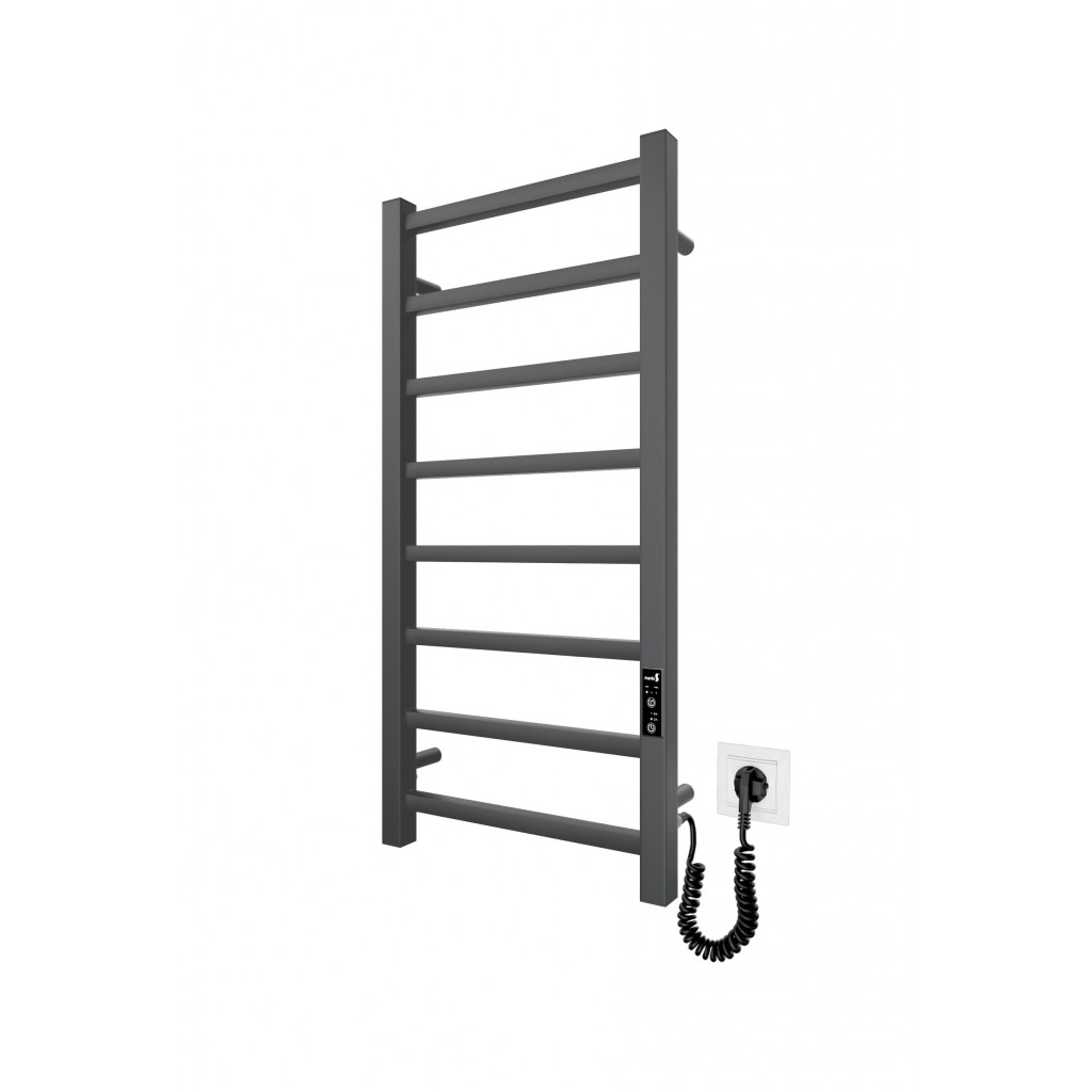 Бытовая электрическая полотенцесушилка Рушникосушка Токіо-I 800x400/80 TR К графіт. Оснащена таймер-регулятором и коннектором для подключения к розетке с любой стороны. Совместима с комплектом скрытого подключения. Имеет 8 перекладин и стойки. Изготовлена из полированной нержавеющей стали без хромирования. Температурные режимы таймер-регулятора: 40°С, 45°С, 50°С. Варианты времени работы: 3, 6 часов и постоянный нагрев. Мощность [3 Вт]. Для удобства использования можно дополнительно оснастить навесными крючками. Гарантия — .