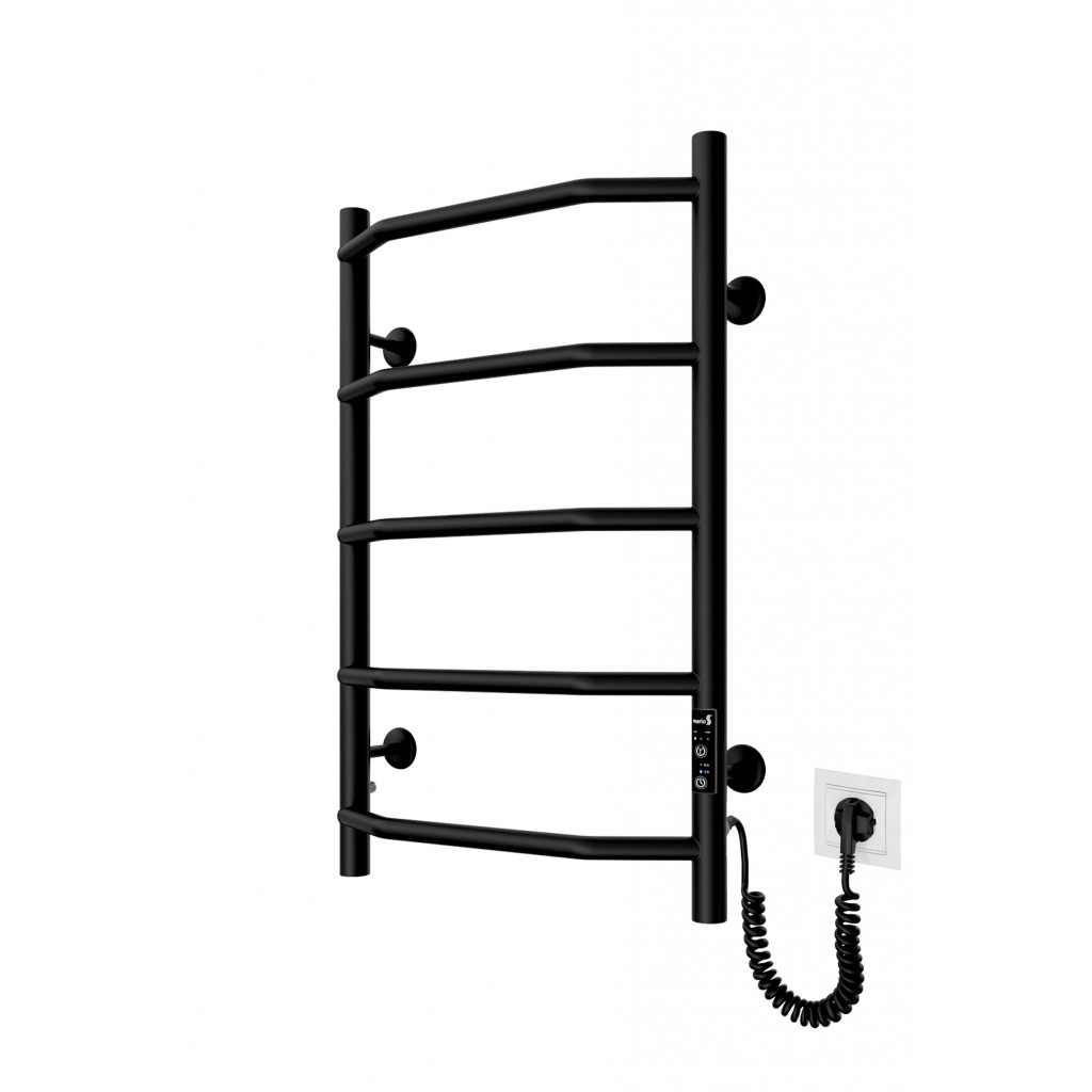 Бытовая электрическая полотенцесушилка Рушникосушка Трапеція НР-І 650х430/110 електр. TR К чорний мат. Оснащена таймер-регулятором и коннектором для подключения к розетке с любой стороны. Совместима с комплектом скрытого подключения. Имеет 5 перекладин и стойки. Изготовлена из полированной нержавеющей стали без хромирования. Температурные режимы таймер-регулятора: 40°С, 45°С, 50°С. Варианты времени работы: 3, 6 часов и постоянный нагрев. Мощность [3 Вт]. Для удобства использования можно дополнительно оснастить навесными крючками. Гарантия — .