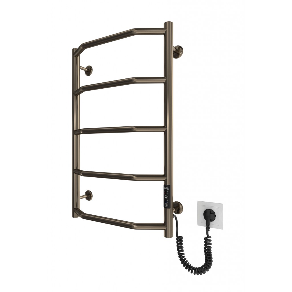 Бытовая электрическая полотенцесушилка Рушникосушка Трапеція НР-І 650х430/110 електр. TR К бронза. Оснащена таймер-регулятором и коннектором для подключения к розетке с любой стороны. Совместима с комплектом скрытого подключения. Имеет 5 перекладин и стойки. Изготовлена из полированной нержавеющей стали без хромирования. Температурные режимы таймер-регулятора: 40°С, 45°С, 50°С. Варианты времени работы: 3, 6 часов и постоянный нагрев. Мощность [3 Вт]. Для удобства использования можно дополнительно оснастить навесными крючками. Гарантия — .
