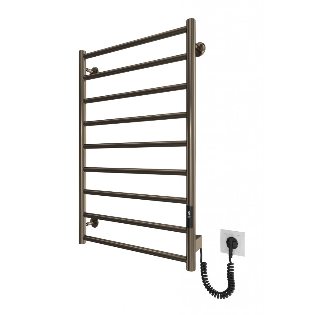 Бытовая электрическая полотенцесушилка Рушникосушка Урбан-I 810x500/85 TR K 2,0 бронза. Оснащена таймер-регулятором и коннектором для подключения к розетке с любой стороны. Совместима с комплектом скрытого подключения. Имеет 9 перекладин и стойки. Изготовлена из полированной нержавеющей стали без хромирования. Температурные режимы таймер-регулятора: 40°С, 45°С, 50°С. Варианты времени работы: 3, 6 часов и постоянный нагрев. Мощность [3 Вт]. Для удобства использования можно дополнительно оснастить навесными крючками. Гарантия — .