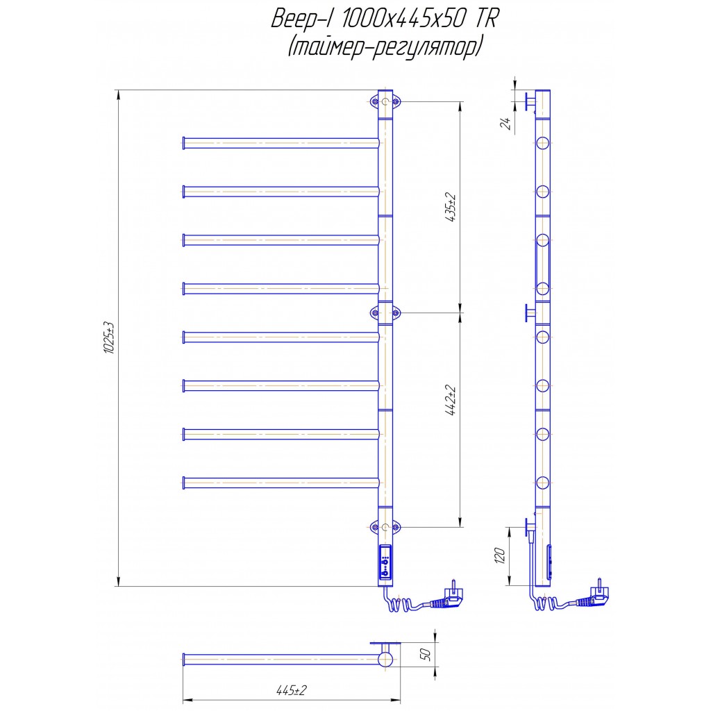 Бытовая электрическая полотенцесушилка Рушникосушка Веєр-I 1000х445/55 електр. TR. Оснащена таймер-регулятором и коннектором для подключения к розетке с любой стороны. Совместима с комплектом скрытого подключения. Имеет 8 перекладин и стойки. Изготовлена из полированной нержавеющей стали без хромирования. Температурные режимы таймер-регулятора: 40°С, 45°С, 50°С. Варианты времени работы: 3, 6 часов и постоянный нагрев. Мощность [3 Вт]. Для удобства использования можно дополнительно оснастить навесными крючками. Гарантия — 60 месяцев.